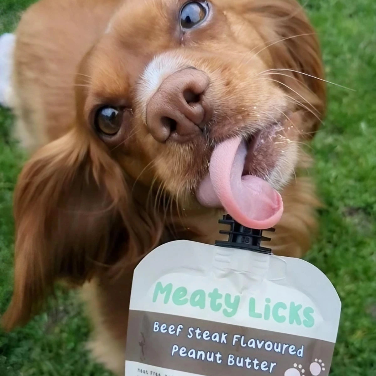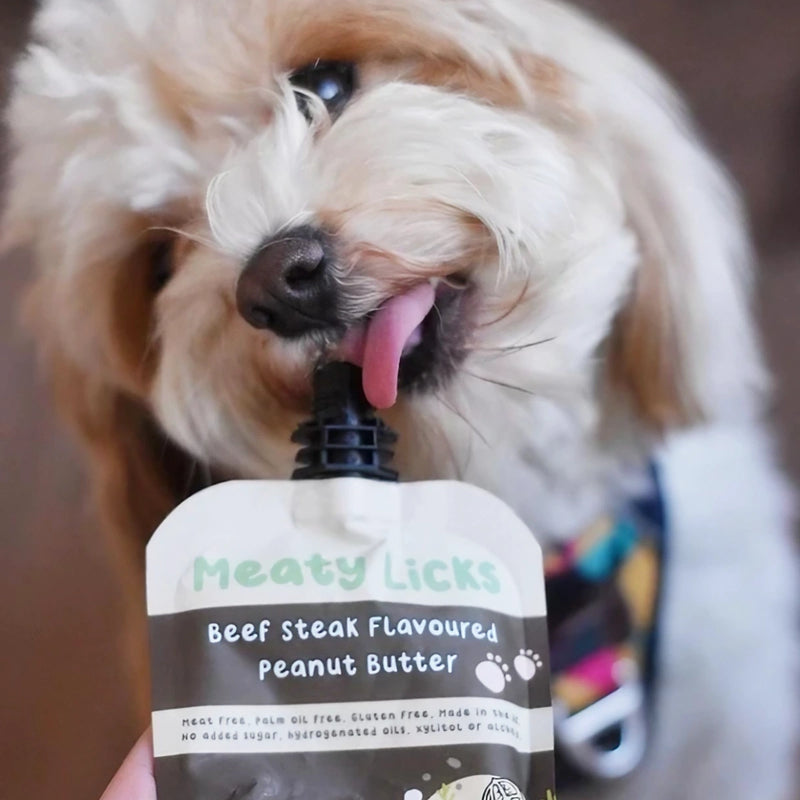 Le beurre de cacahuète Meaty Licks aromatisé au bœuf est un snack pour chien à lécher, végétalienne et sans gluten.