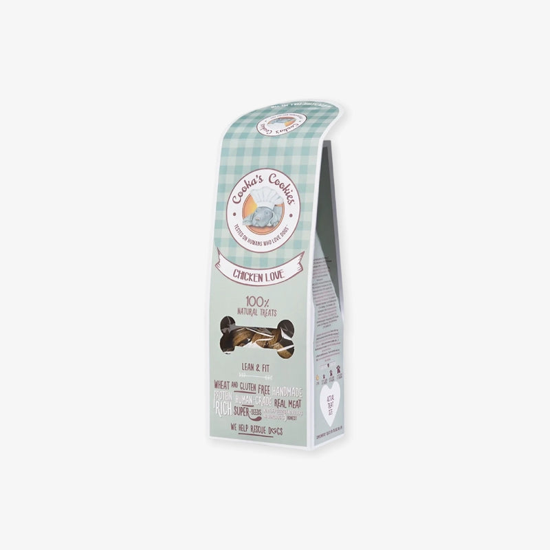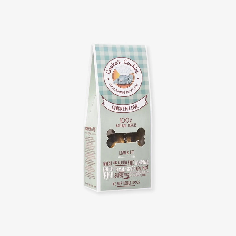 Les biscuits au poulet et carottes pour chien de Cooka’s Cookies sont fabriqués artisanalement au Portugal. Présentées en petites formes de cœur, ces friandises appétissantes sont parfaites pour récompenser les chiens.