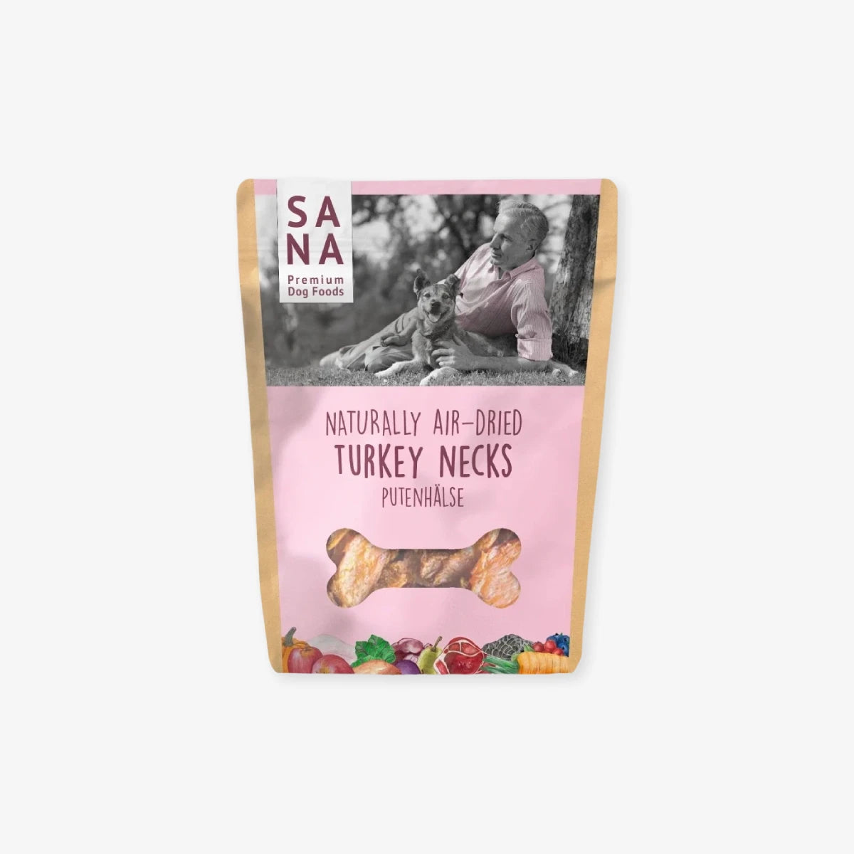 Les cous de dinde Sanadog sont des friandises à mâcher très appréciées par les chiens. Ils mesurent environ 20 cm. Les cous sont cuits lentement au four à basse température pour préserver leur saveur et leurs nutriments, puis longuement séchés sans aucun additif. Ils sont soigneusement sélectionnés et proviennent de sources locales en Allemagne.