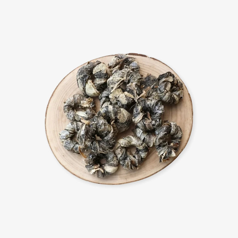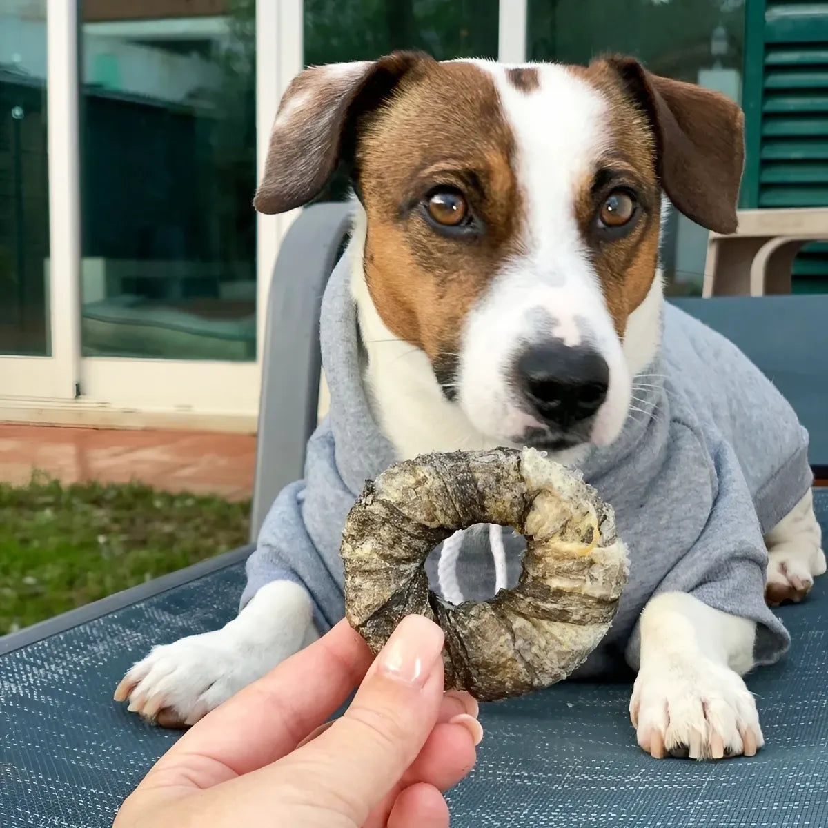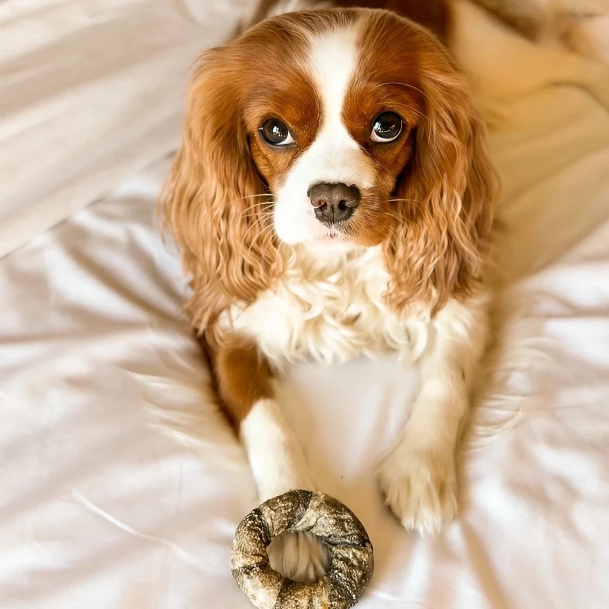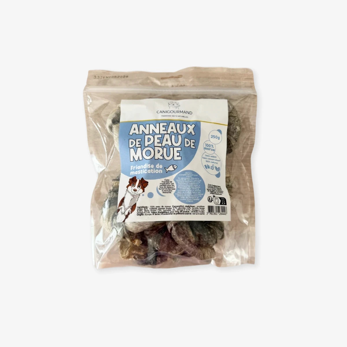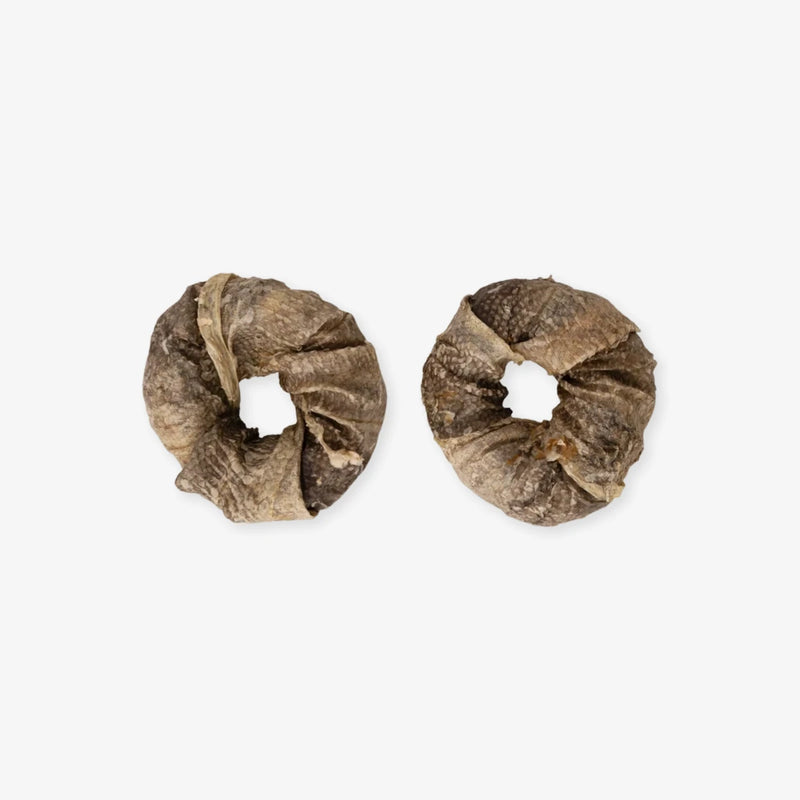 Les donuts à la morue de Canigourmand sont des friandises à mâcher riches en oméga-3. Ils sont fabriqués à partir de peau de morue pure.