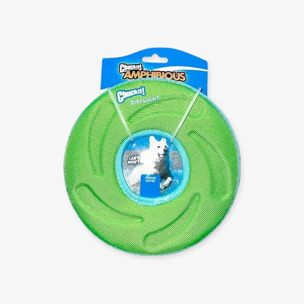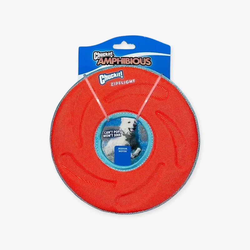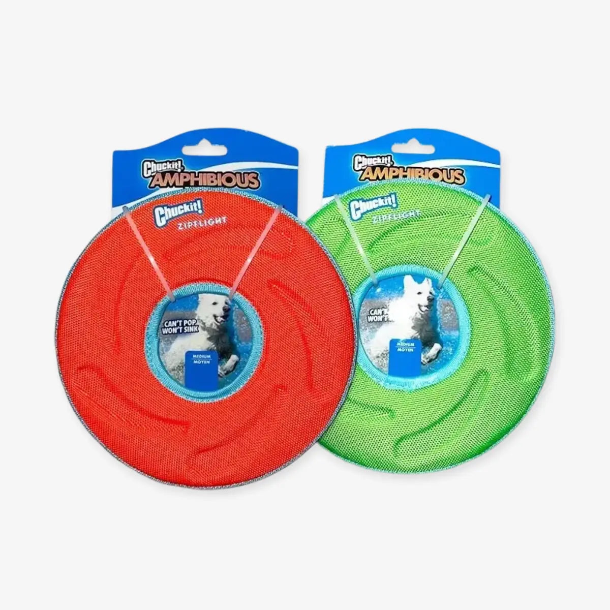 Doté de couleurs vives, ce frisbee Chuckit est facilement perceptible dans l’eau ou dans l’herbe par votre chien et par vous.