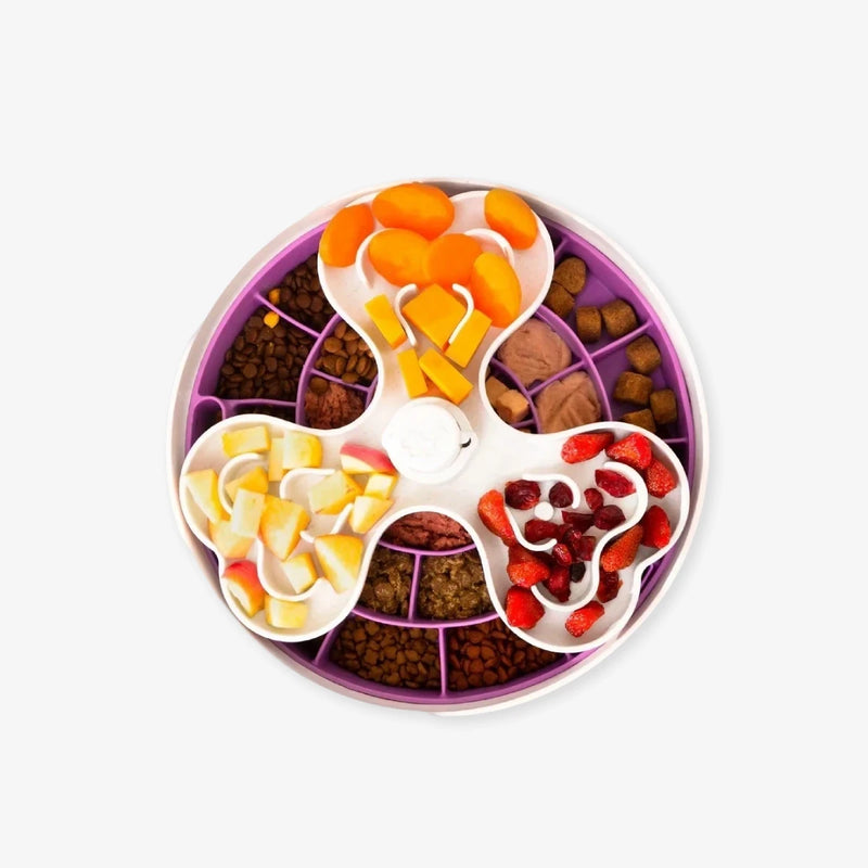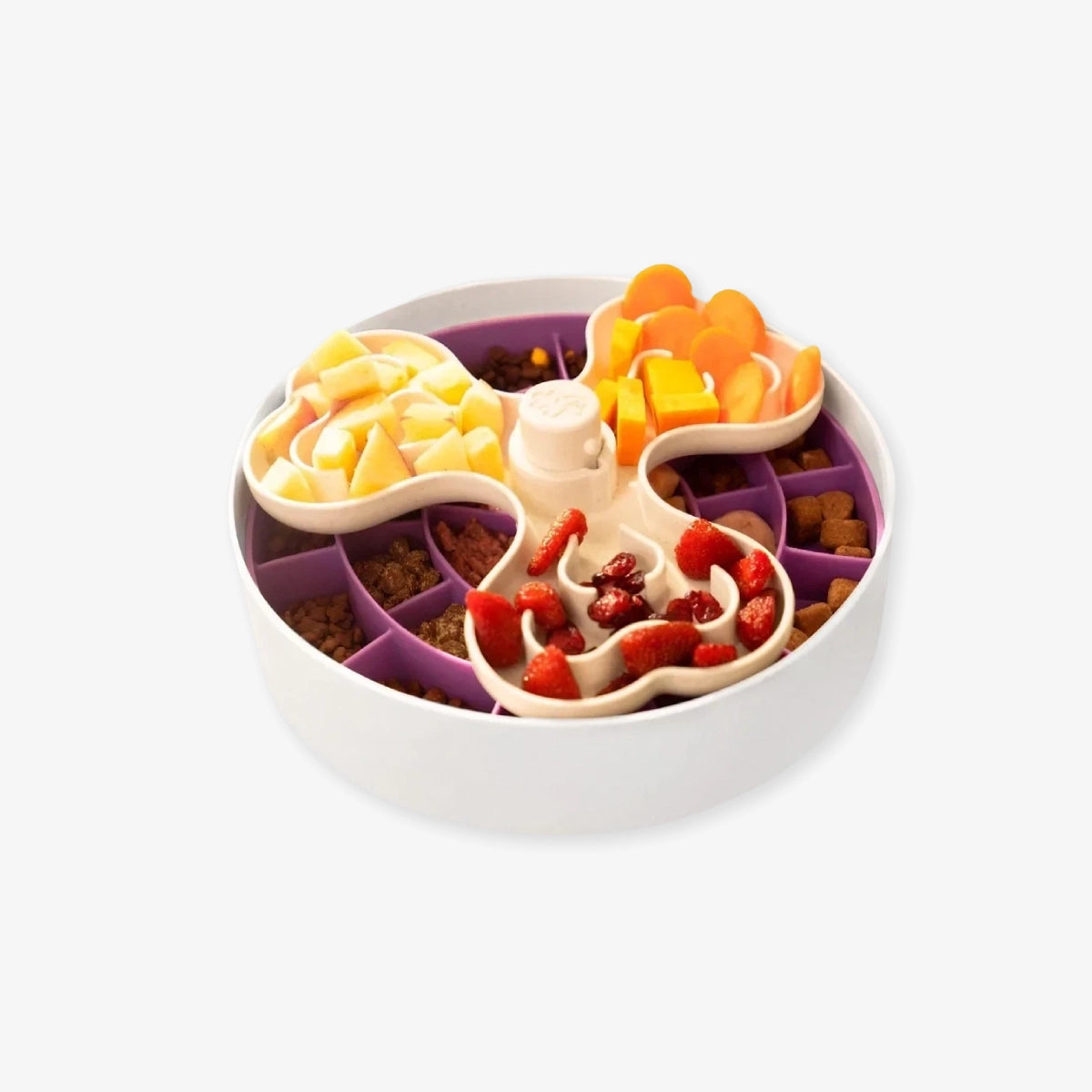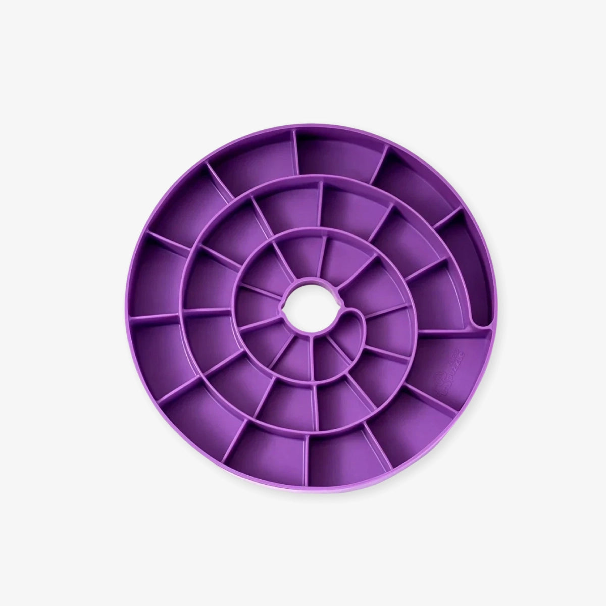 • Le tapis violet, en silicone souple, a une forme en spirale qui forme un chemin rempli de mini-compartiments.