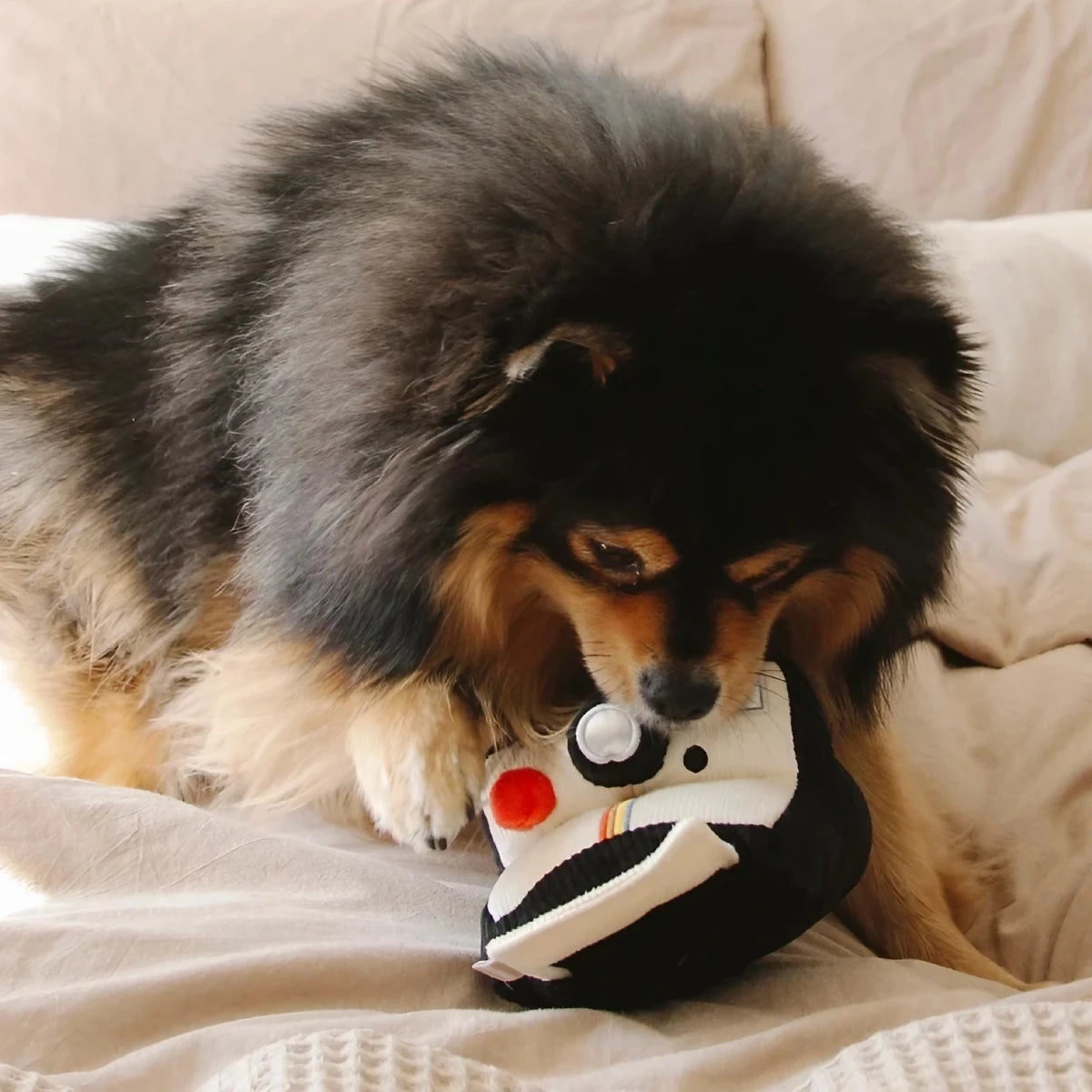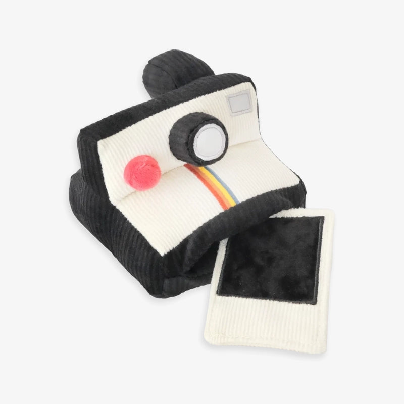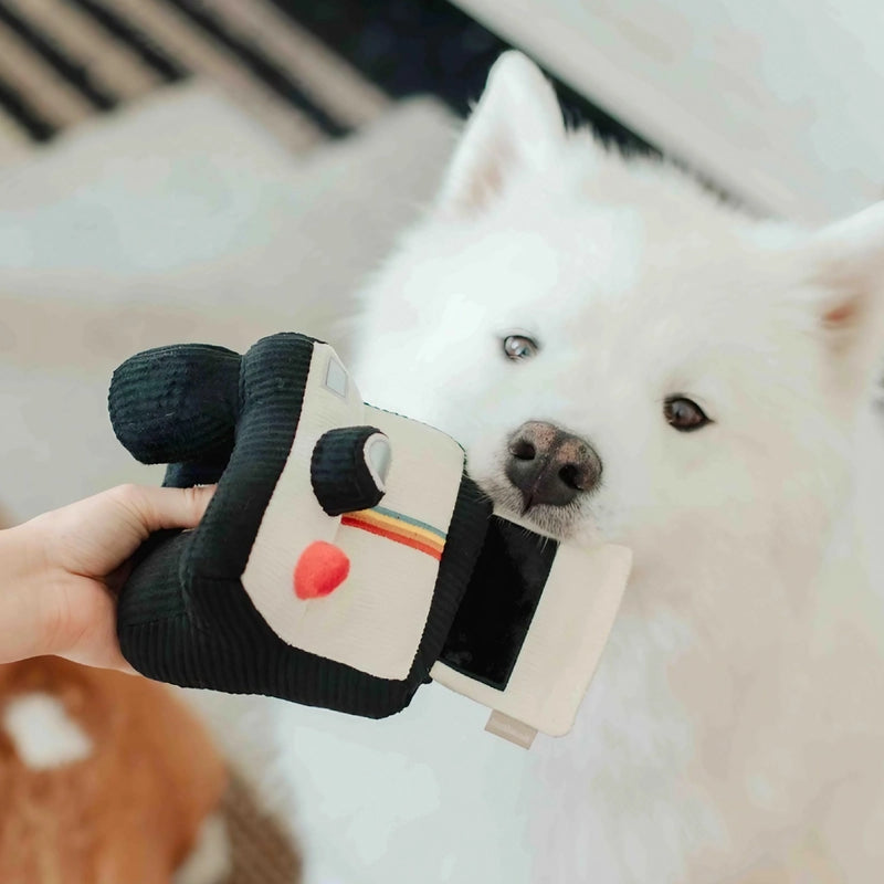 L'appareil photo de Lambwolf Collective est un jeu d'occupation pour chien. Ce polaroid comporte deux pouic pouic : un maxi couineur dans l’appareil photo et un petit au niveau du viseur. Il y a aussi un “papier photo” avec du papier froissé.