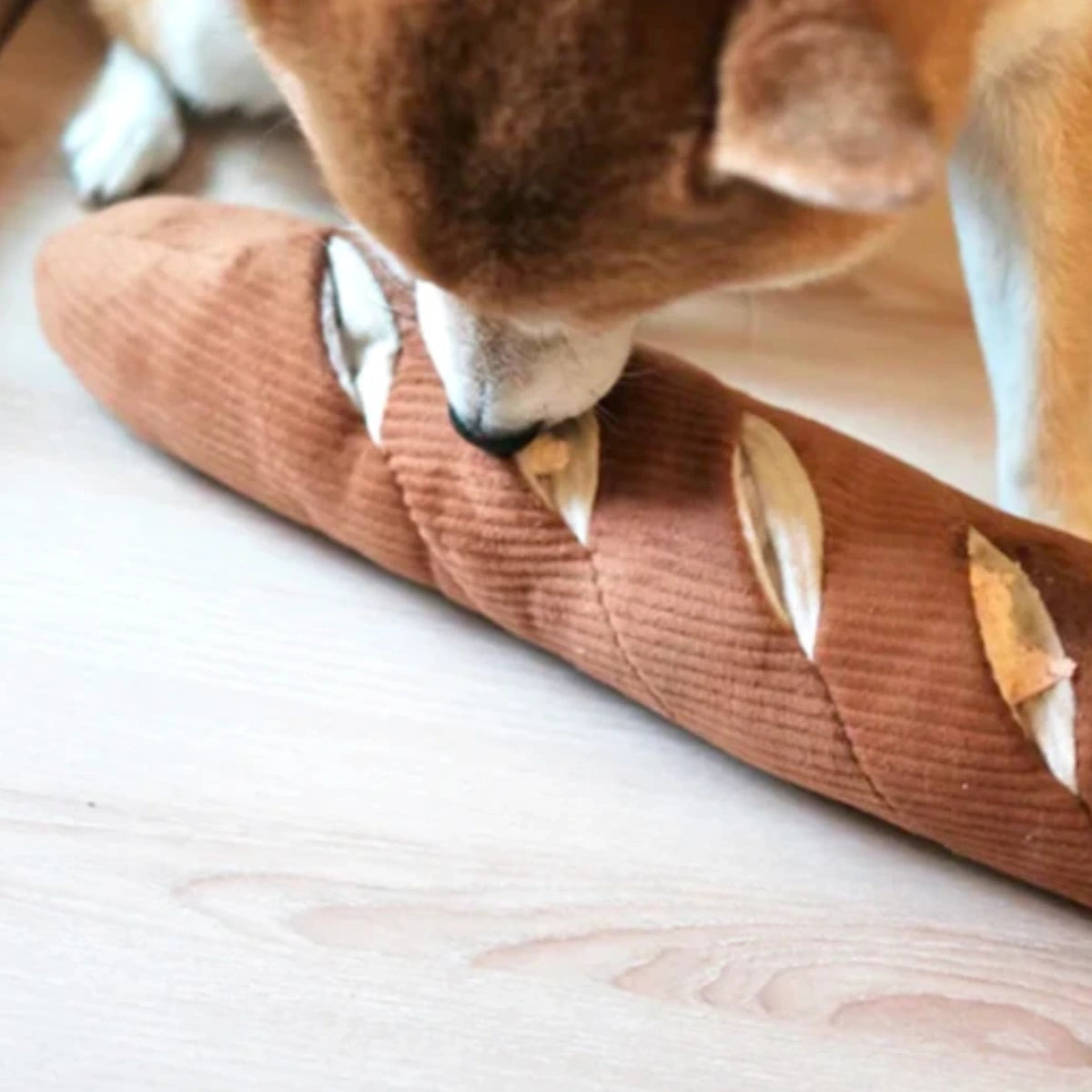 La baguette possède des cachettes à friandises, couineurs intégrés, un sachet avec du papier froissé. Il encourage de manière ludique le chien à utiliser son flair.