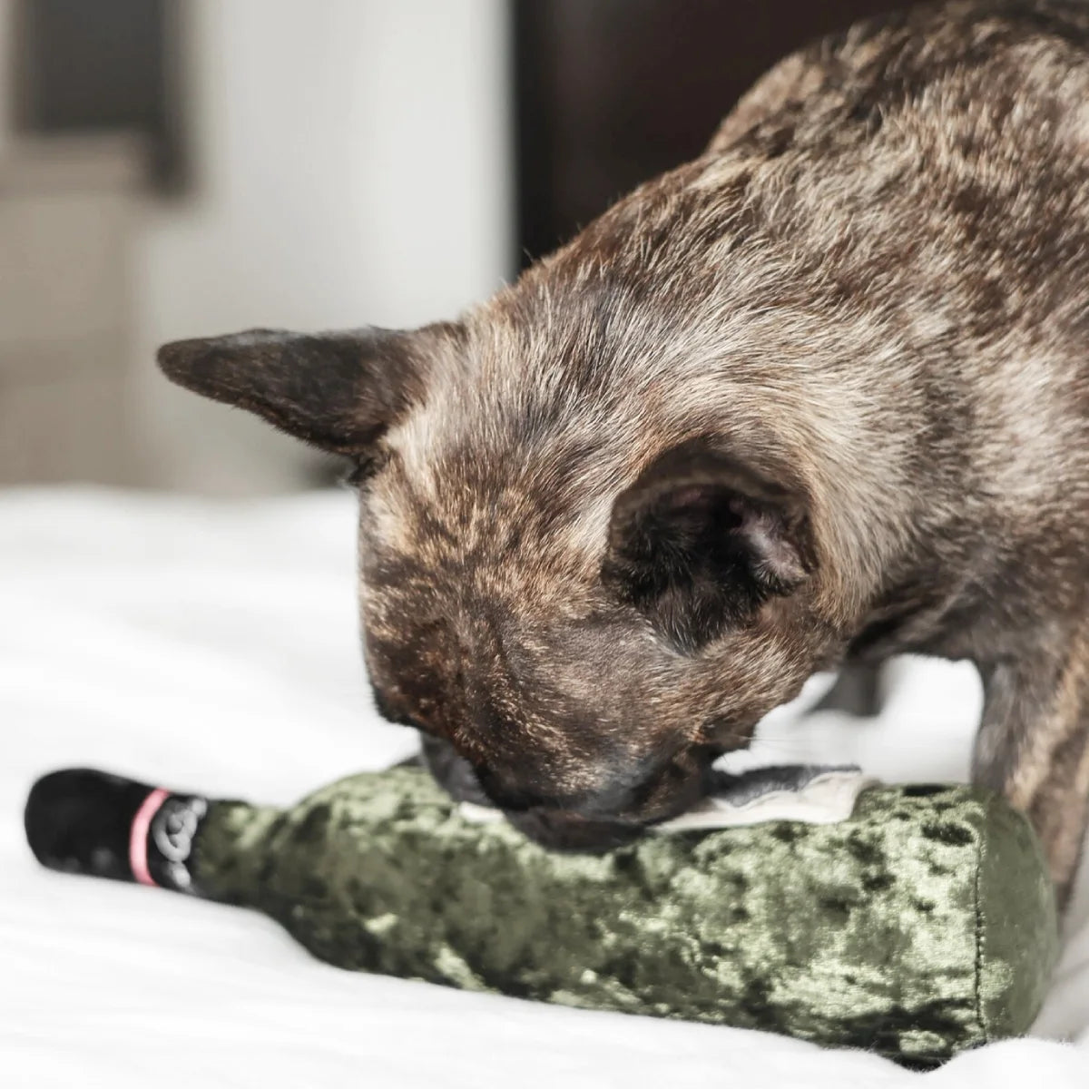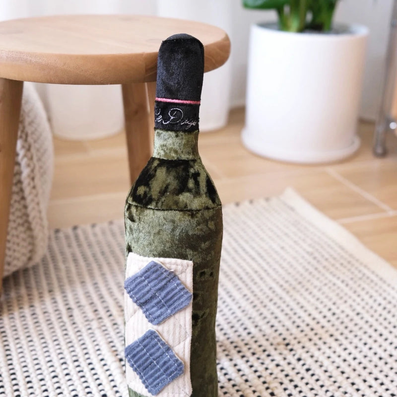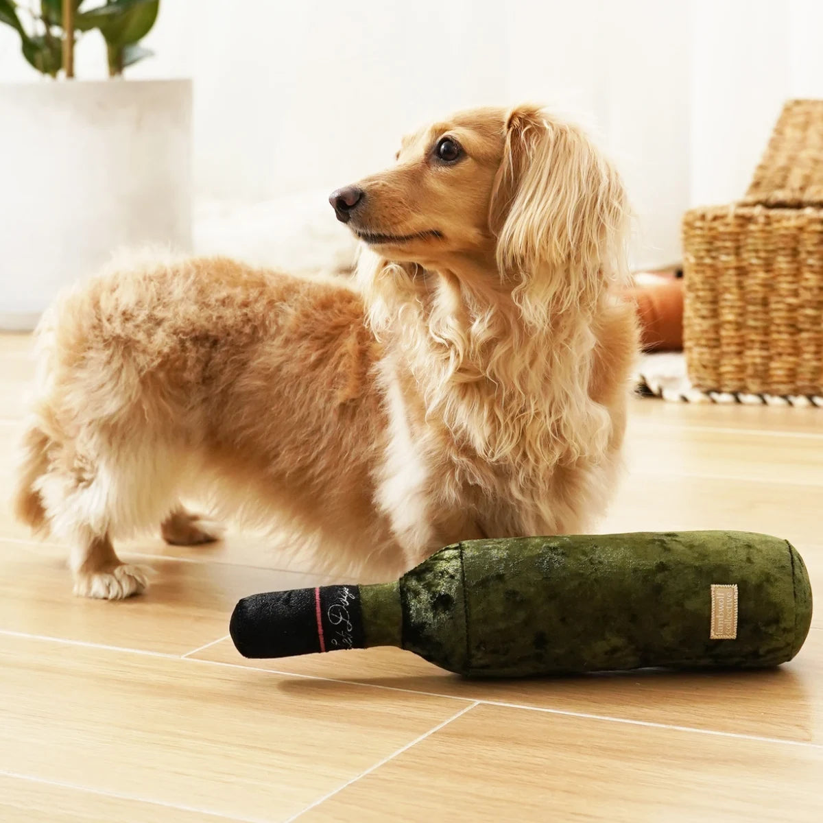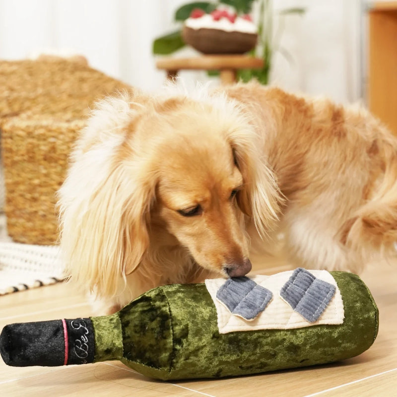 Le jeu de fouille bouteille de vin de Lambwolf Collective est un jouet original pour les petits et moyens chiens. Avec ses poches pour cacher des friandises et son couineur, il invite le chien à jouer et à chercher.