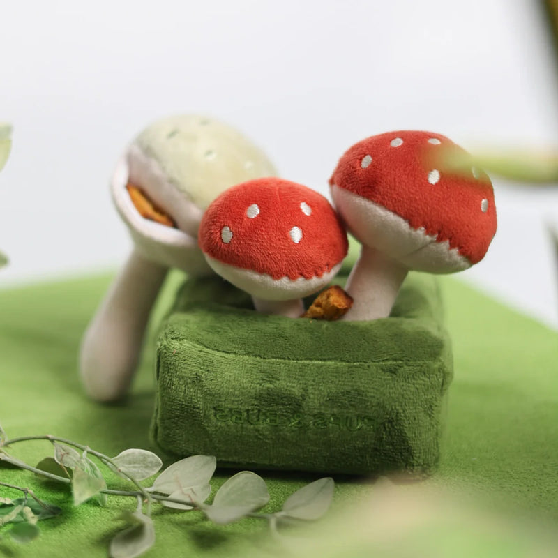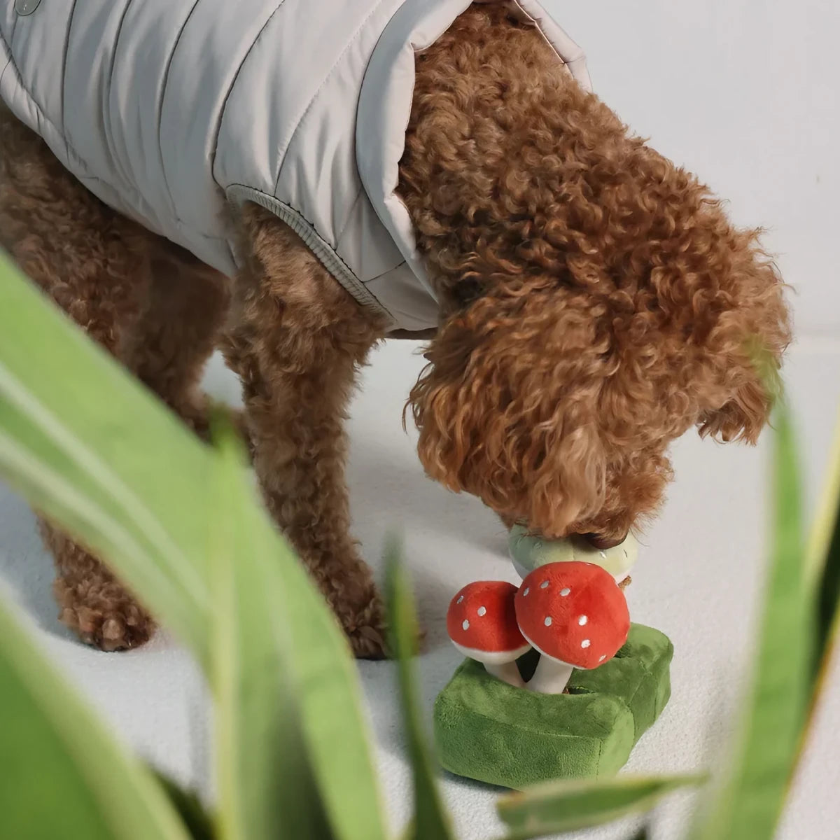 Le jeu de fouille forêt de champignons de Pups & Bubs possède plusieurs cachettes à friandises, des couineurs et du papier froissé. C’est un jeu d’occupation ludique et sensoriel qui favorise la stimulation mentale et l’exploration olfactive.