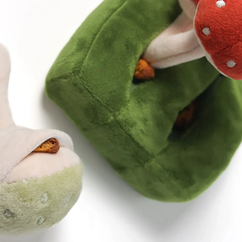 • Une poche secrète dans le champignon vert pour ajouter des friandises. Il est doté de papier froissé, pour éveiller la curiosité et encourager l’interaction.