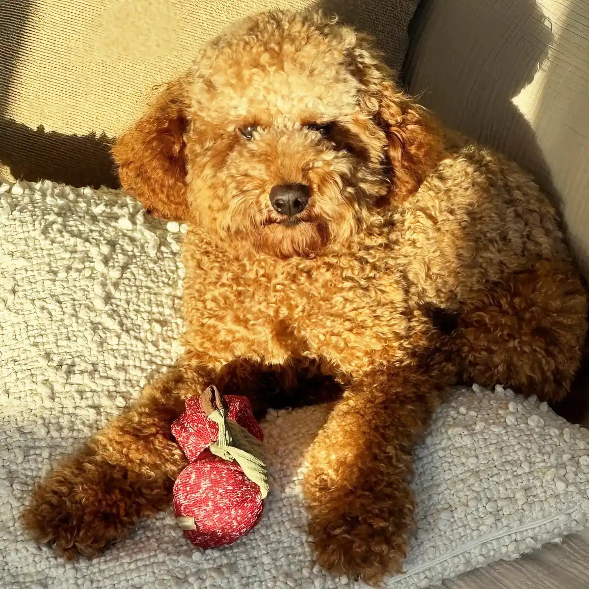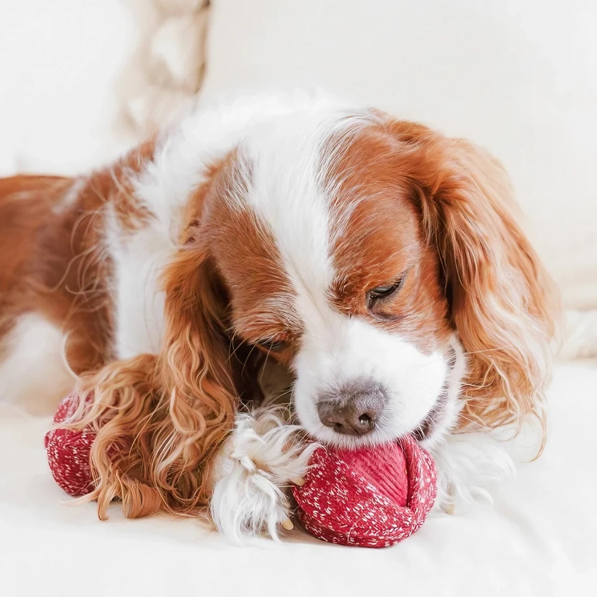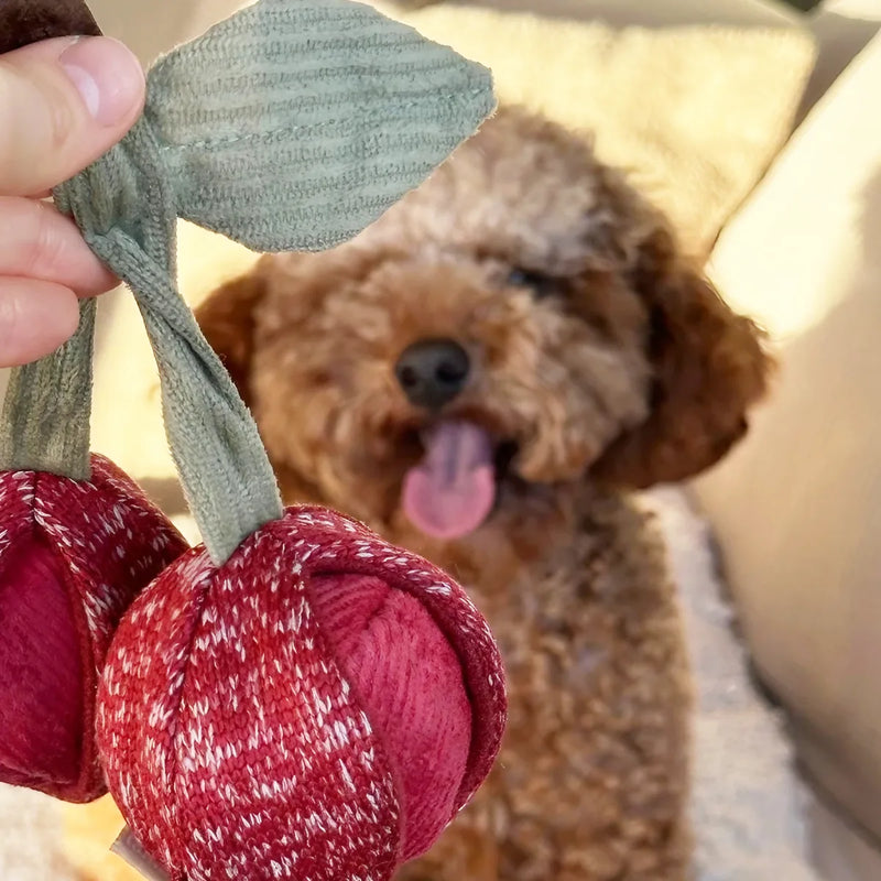 Cherry Pop est un jeu de recherche pour chien de Lambwolf Collective. Il est confectionné en tissu tricoté durable, doux et résistant. Il est doté de deux petites balles TPR qui rebondissent et couinent pour capter l’attention du chien.