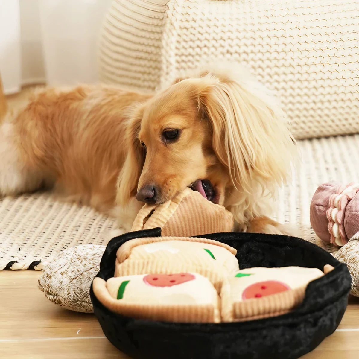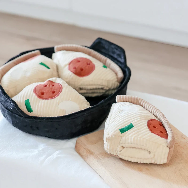 Le jouet deep dish pizza de Lambwolf Collective imite une pizza dans un plat en papier froissé, divisé en quatre parts, dans lequel on retrouve huit cachettes pour y dissimuler des friandises. Les petits couineurs attirent l’attention du chien.