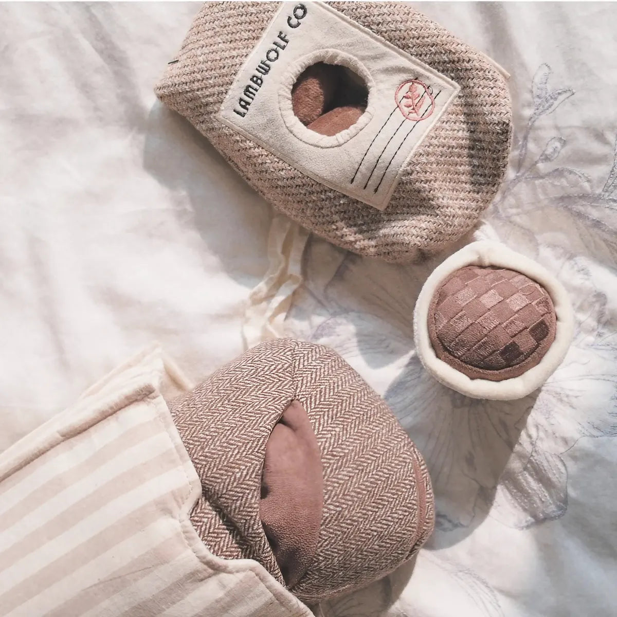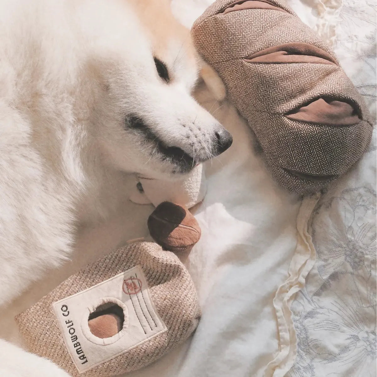 Le jeu de fouille Grains de Café de Lambwolf Collective est un jouet d’occupation pour les petits chiens. Il comprend trois grains de café avec couineur, cachés dans un sachet texturé qui fait un bruit de papier froissé.