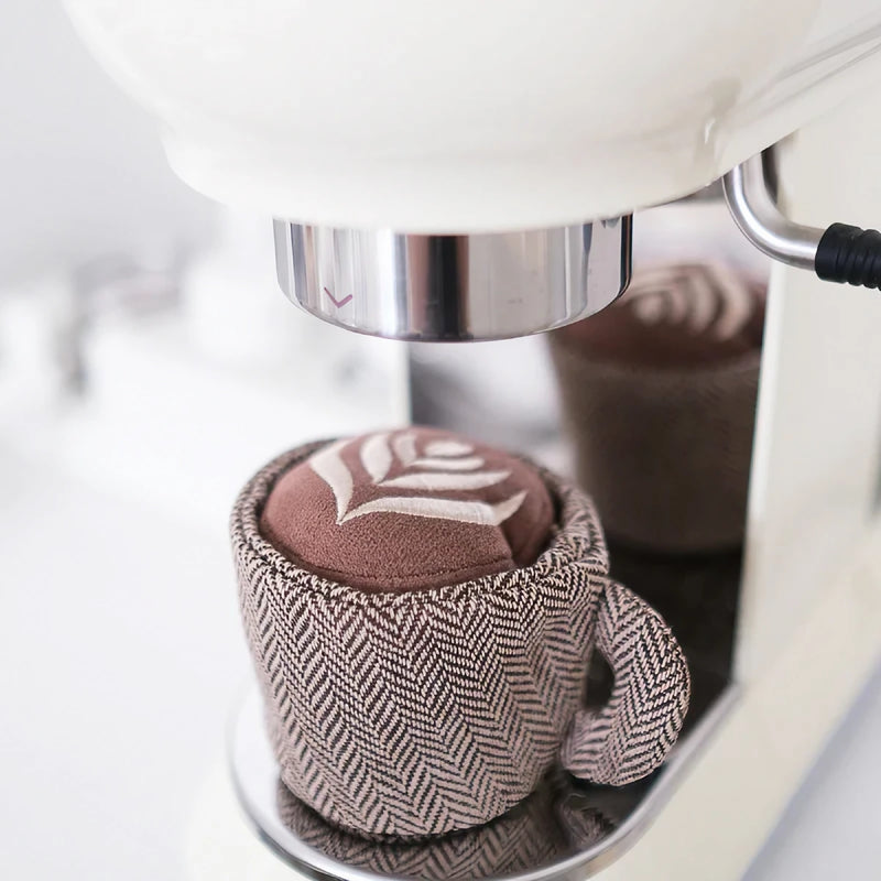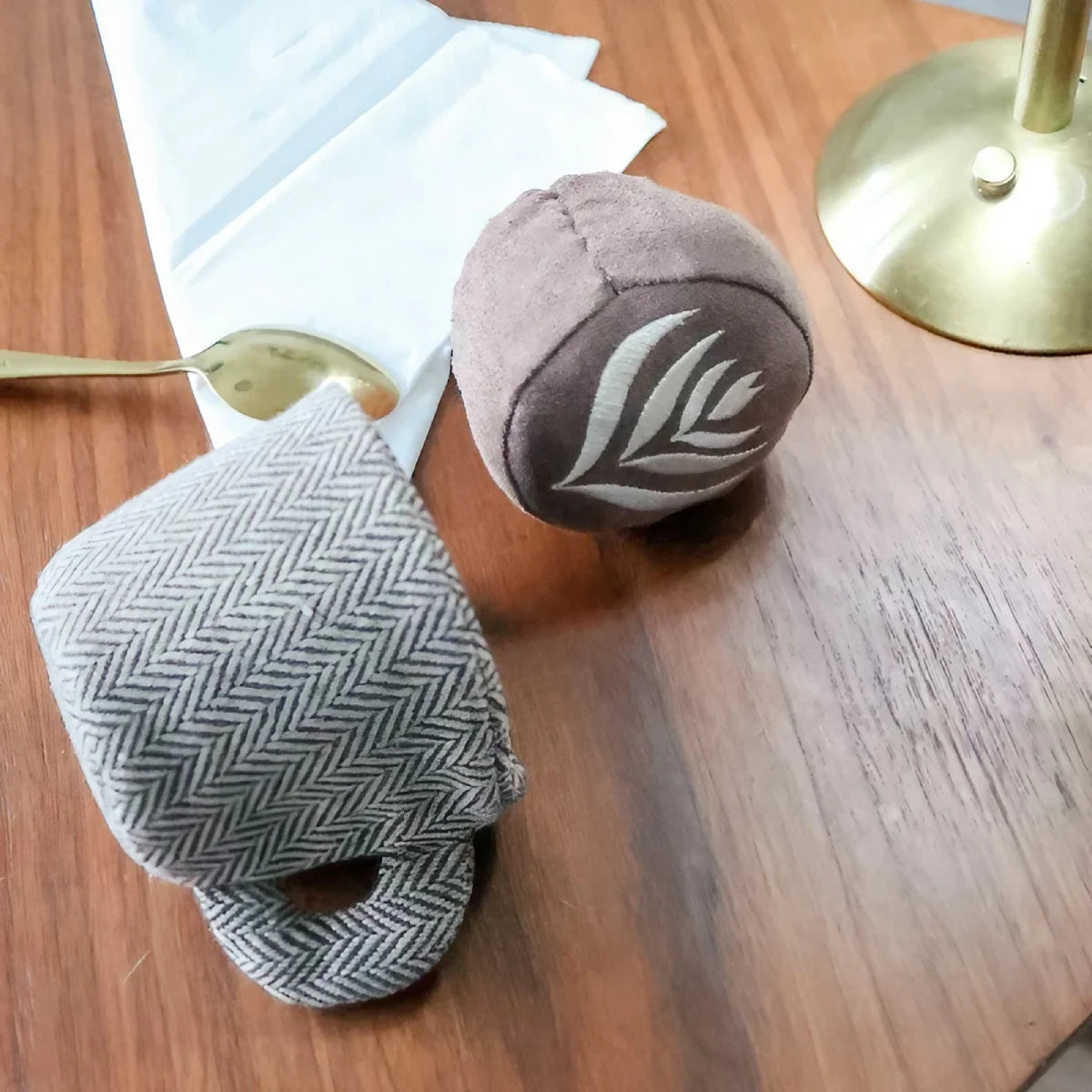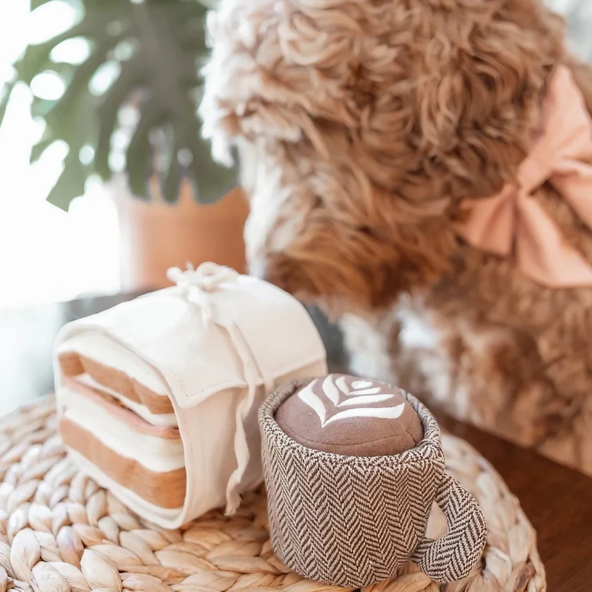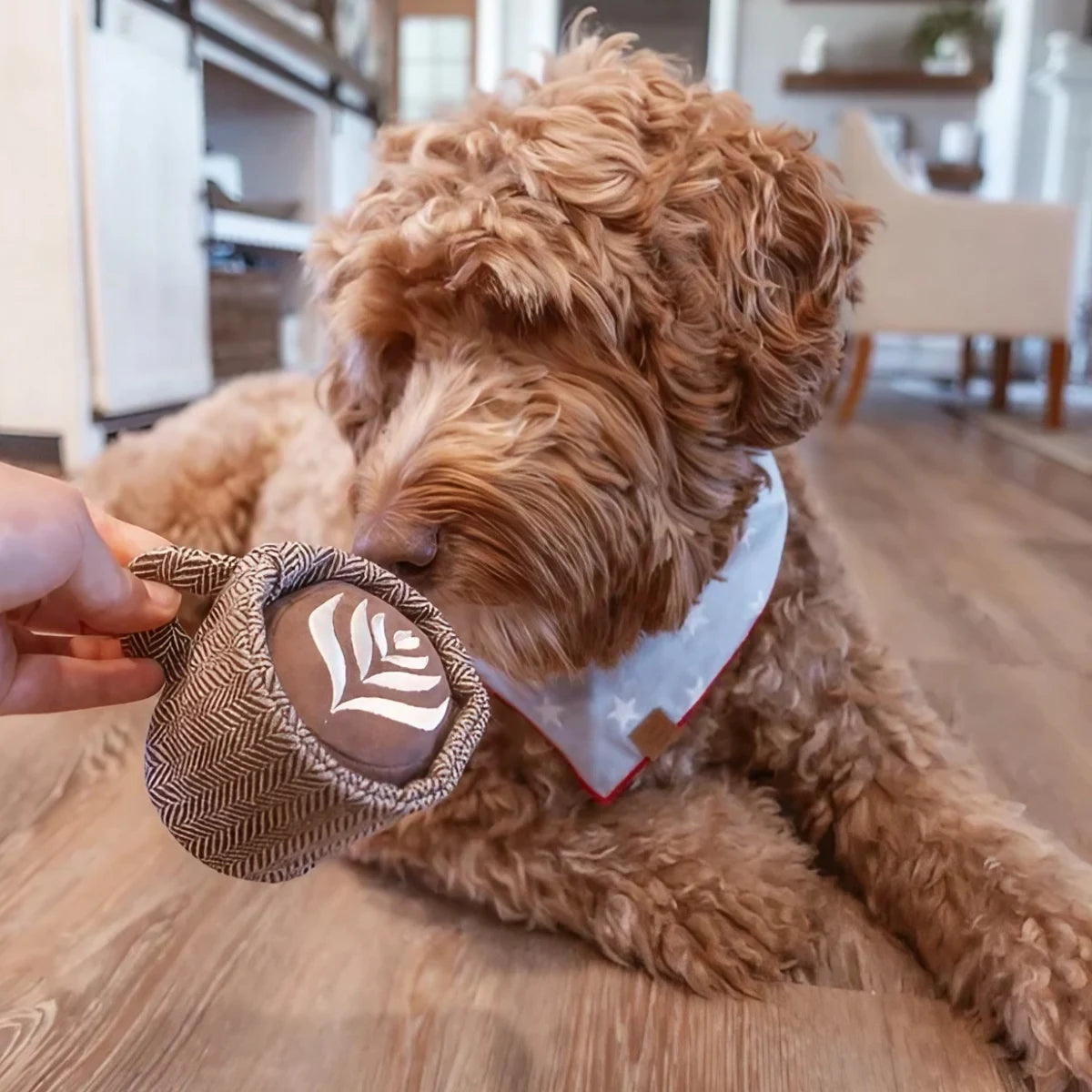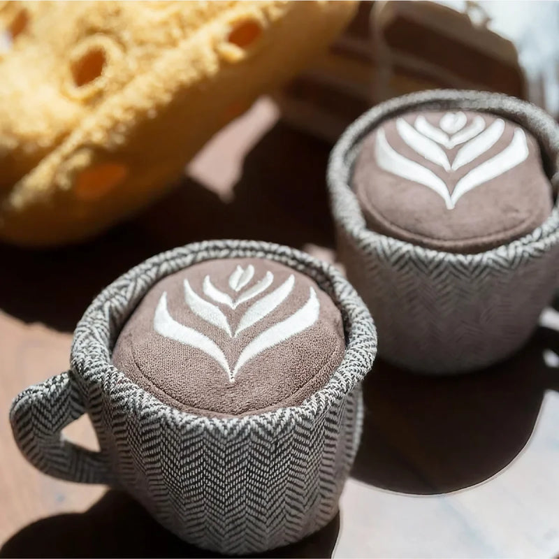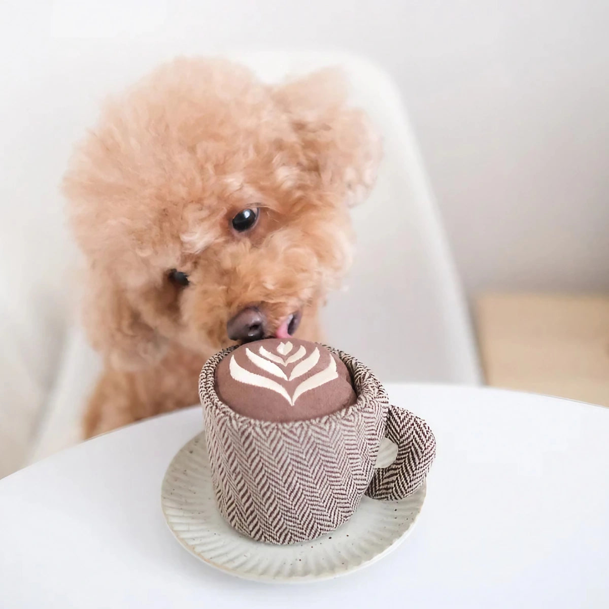 Le jeu d’occupation pour chien Latte Pop de Lambwolf Collective est en forme de tasse de café. Ce jeu de fouille permet de cacher des friandises dans la tasse pour stimuler le flair du chien.