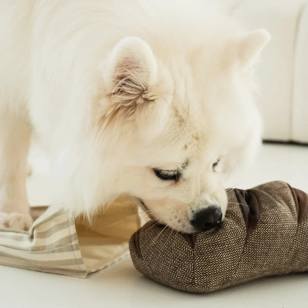 Le jeu de fouille RYE de Lambwolf Collective est un jouet d’occupation pour chien en forme de pain qui allie peluche et recherche de friandises.
