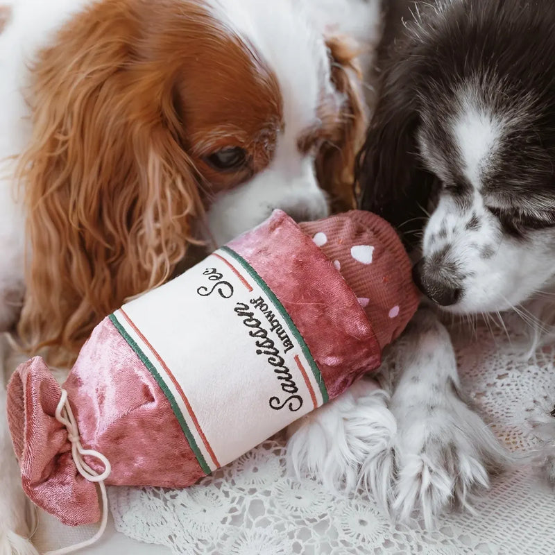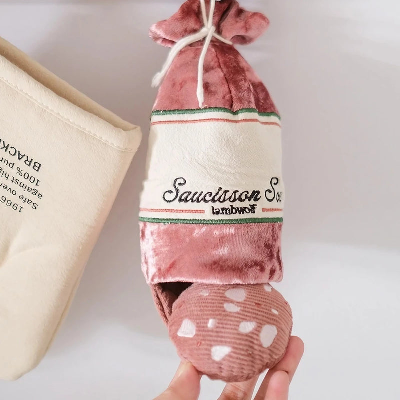 Ce jeu de fouille pour chien de Lambwolf Collective s’inspire de la gastronomie française avec son design original en forme de saucisson. Il contient trois petites rondelles en peluche douce, chacune équipée d’un couineur. Le saucisson contient du papier froissé.