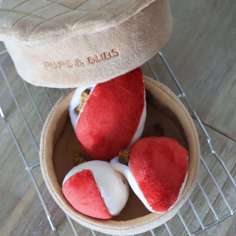 La tarte aux pommes de Pups & Bubs propose plusieurs cachettes à friandises pour varier la difficulté et prolonger l’occupation. Le jouet de recherche est composé d’un fond de tarte et son couvercle ainsi que trois quartiers de pomme :