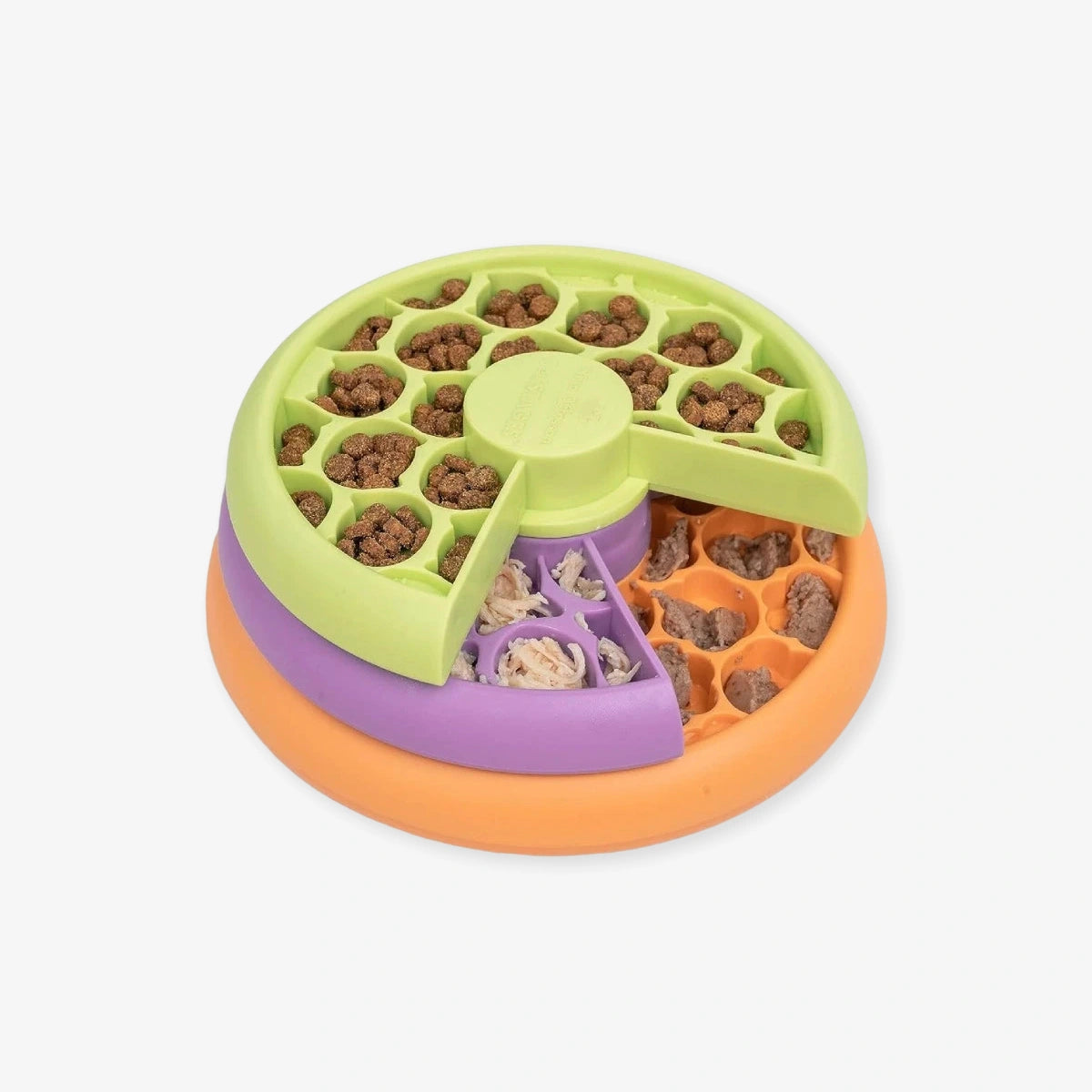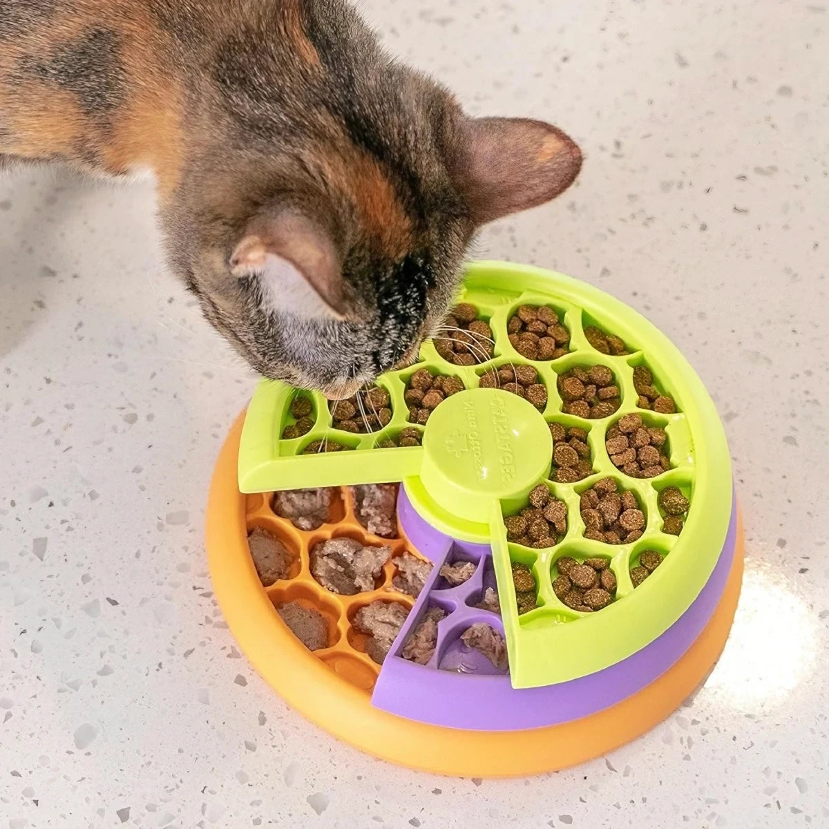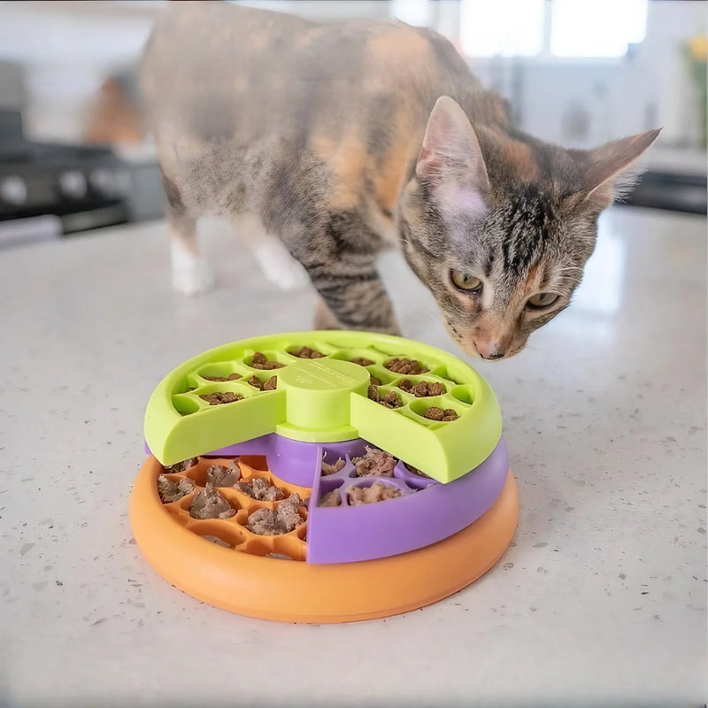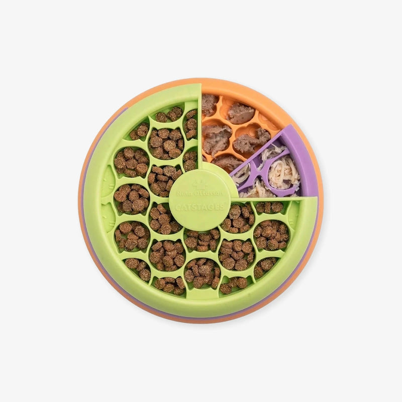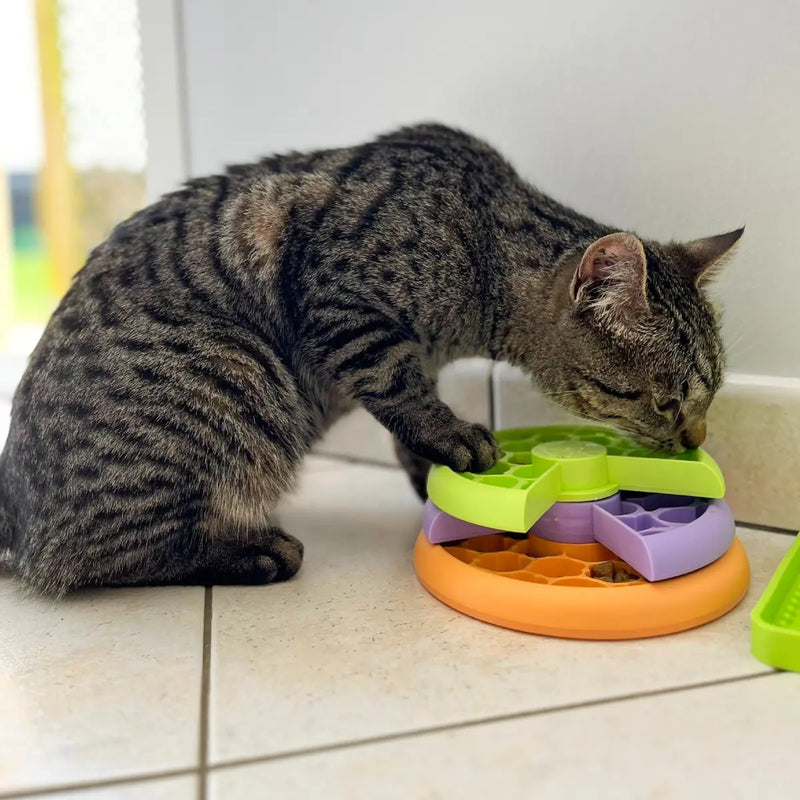 Avec ses 70 compartiments destinés à accueillir friandises, croquettes, ou nourriture humide, il encourage le chat à manger plus lentement.