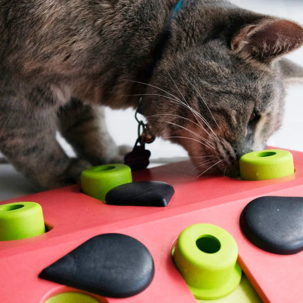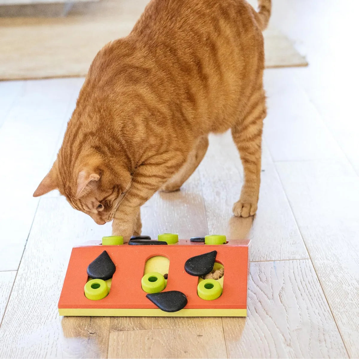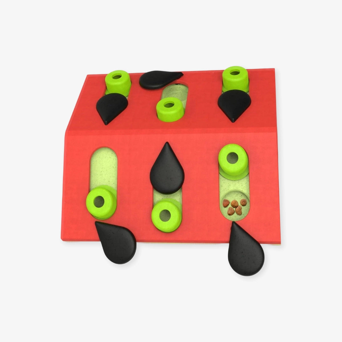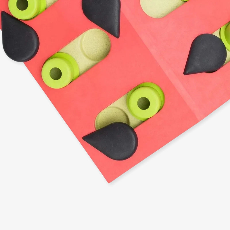 Les pièces noires en forme de graines doivent être tournées avec les pattes, et les pièces vertes doivent être poussées pour découvrir les récompenses. La surface inclinée du jeu augmente la difficulté et stimule encore plus l’esprit du chat.