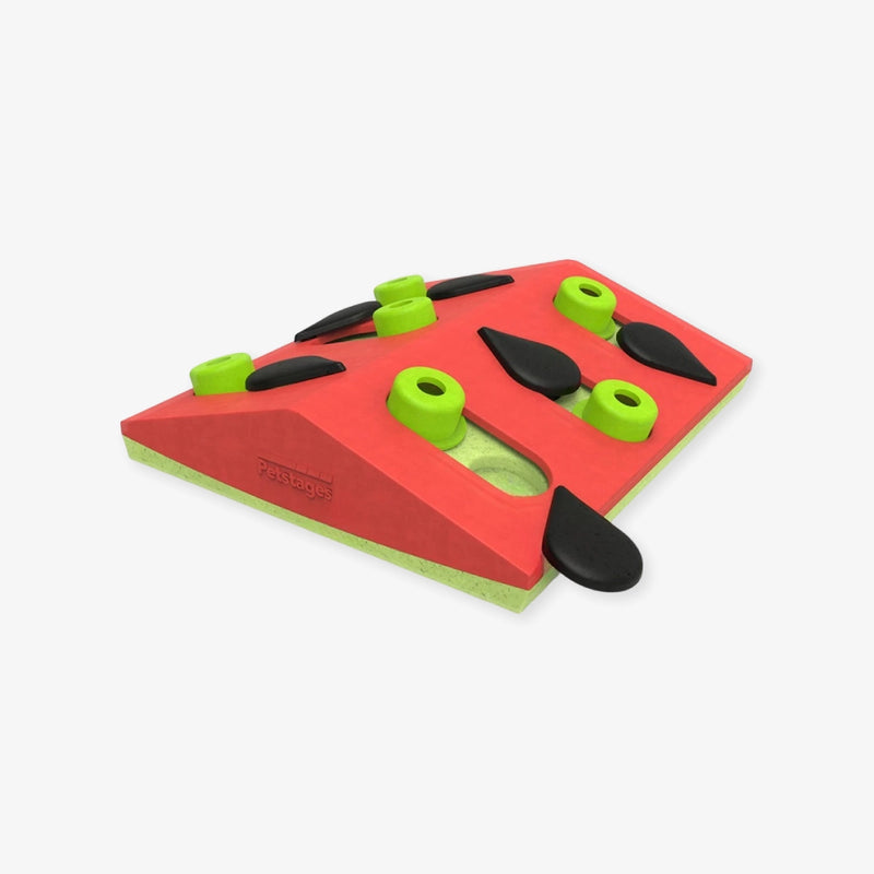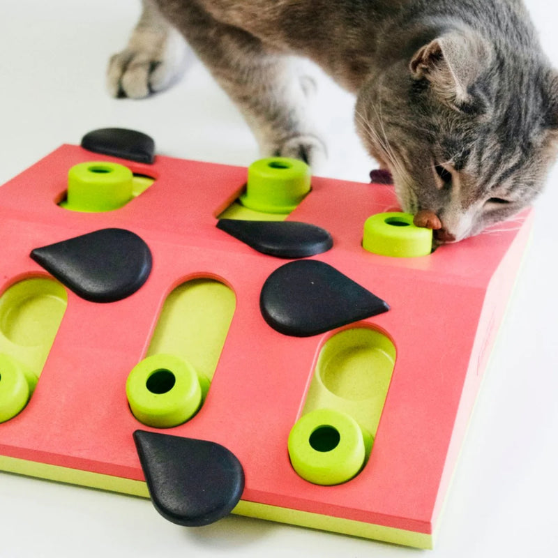 Le jeu d’intelligence Melon Madness de Nina Ottosson comporte 6 compartiments à friandises et des éléments coulissants. Il le stimule mentalement du chat et lutte contre l’ennui.