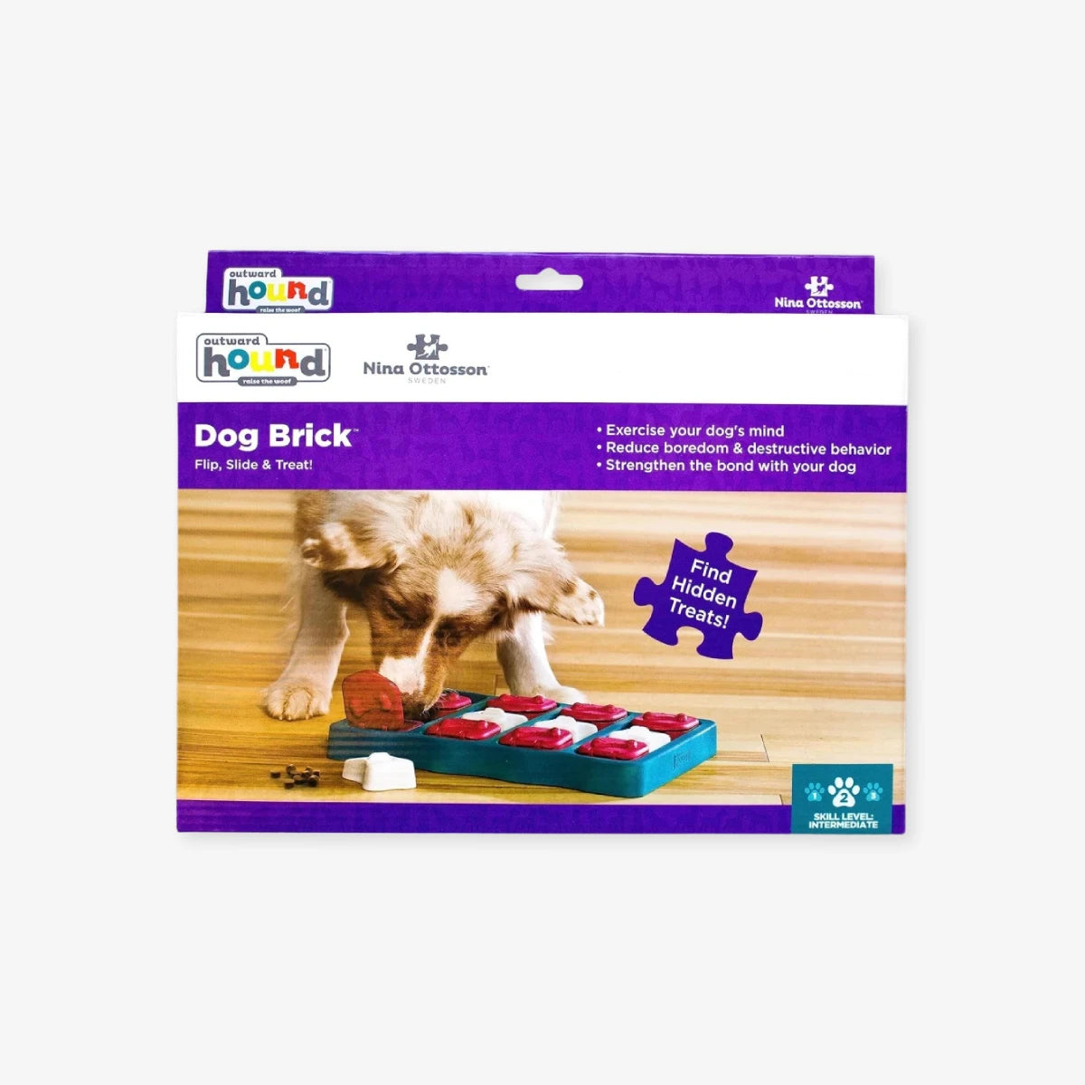 Le dog brick est un jeu d'intelligence conçu par Nina Ottosson. Il est classé comme un jouet de difficulté niveau 2 (intermédiaire). Nous le recommandons pour les chiens et chiots ayant déjà expérimenté les jeux de recherche simples.