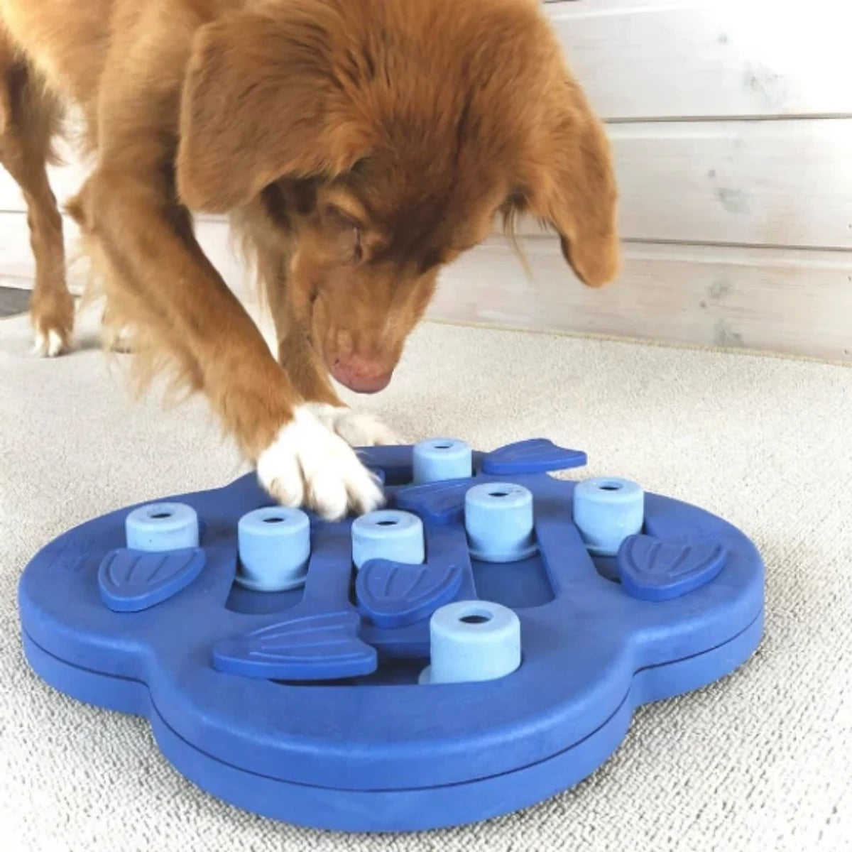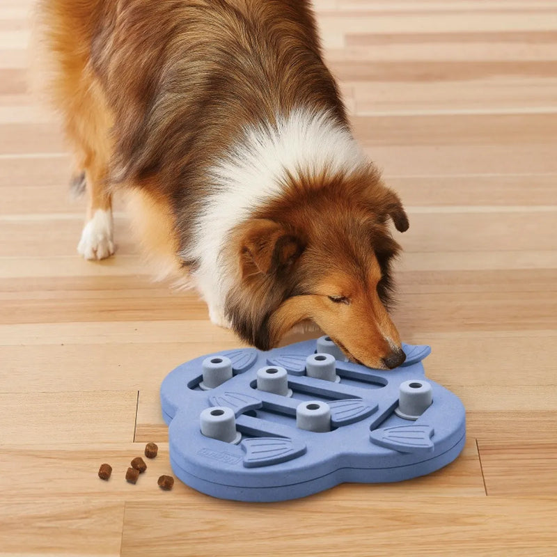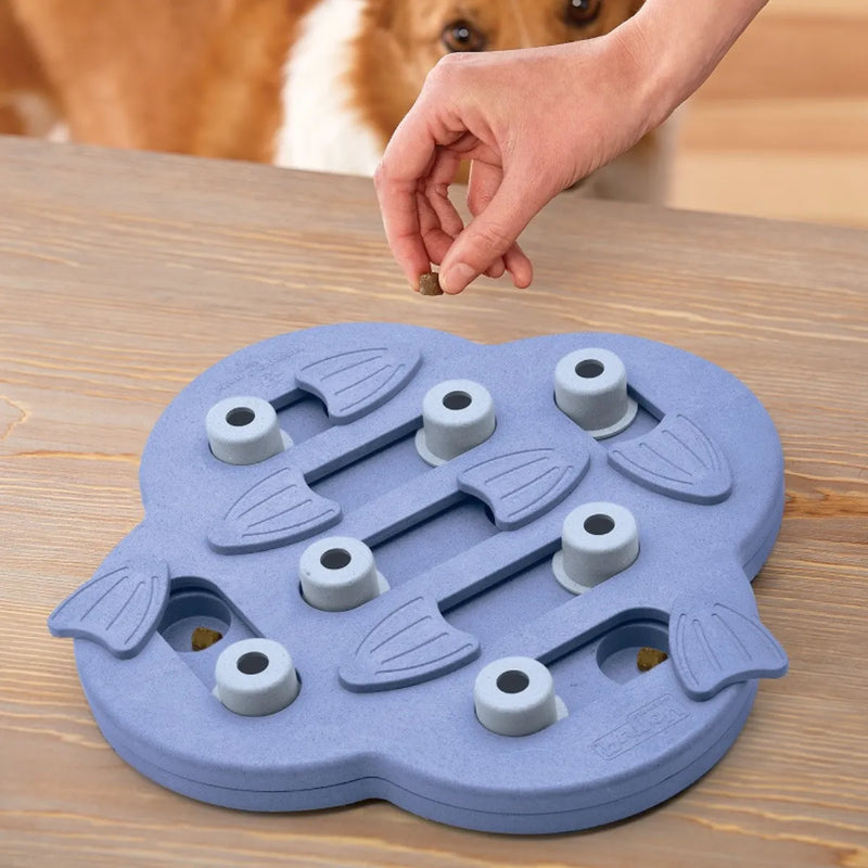 C'est un puzzle pour chien riche en défis ! Il est composé de 14 compartiments : 7 blocs coulissants et 7 nageoires pivotantes. Les pièces sont non-amovibles pour jouer en toute sécurité. Les cachettes sont assez larges pour y glisser des croquettes ou des friandises sèches.