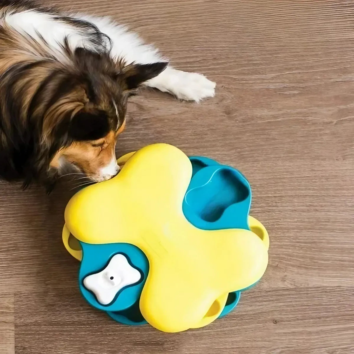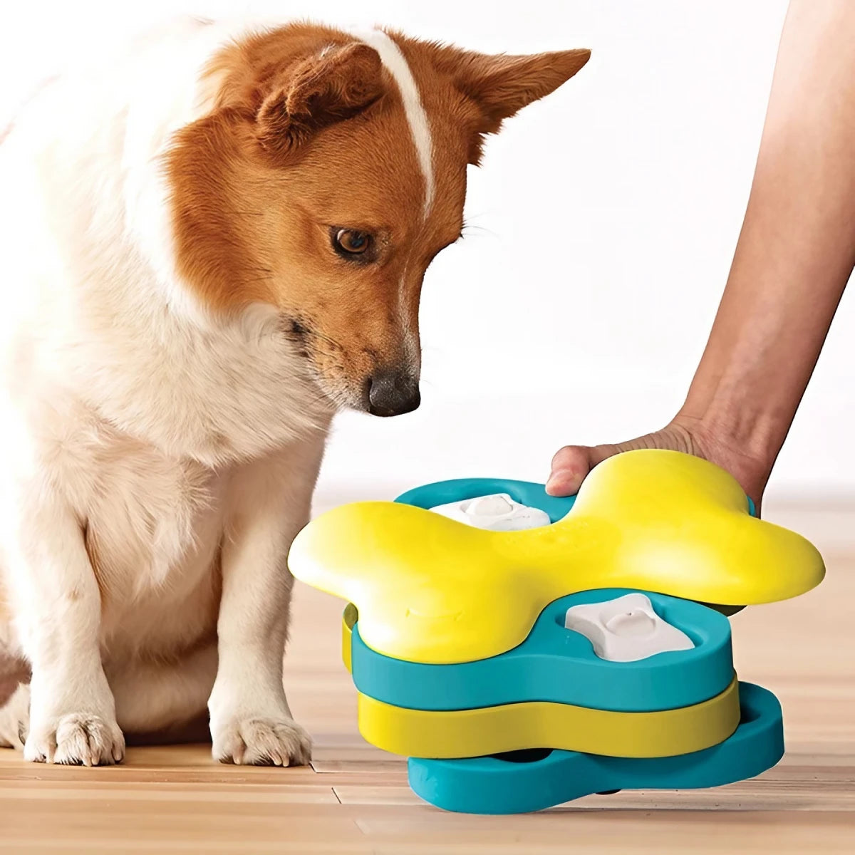 Ce puzzle interactif de niveau 2 propose un certain défi grâce à ses 12 compartiments répartis sur 4 étages rotatifs, dont 3 pouvant accueillir des friandises ou des croquettes. Les 3 os blancs inclus permettent de couvrir certains compartiments pour augmenter la difficulté et encourager le chien à réfléchir davantage.