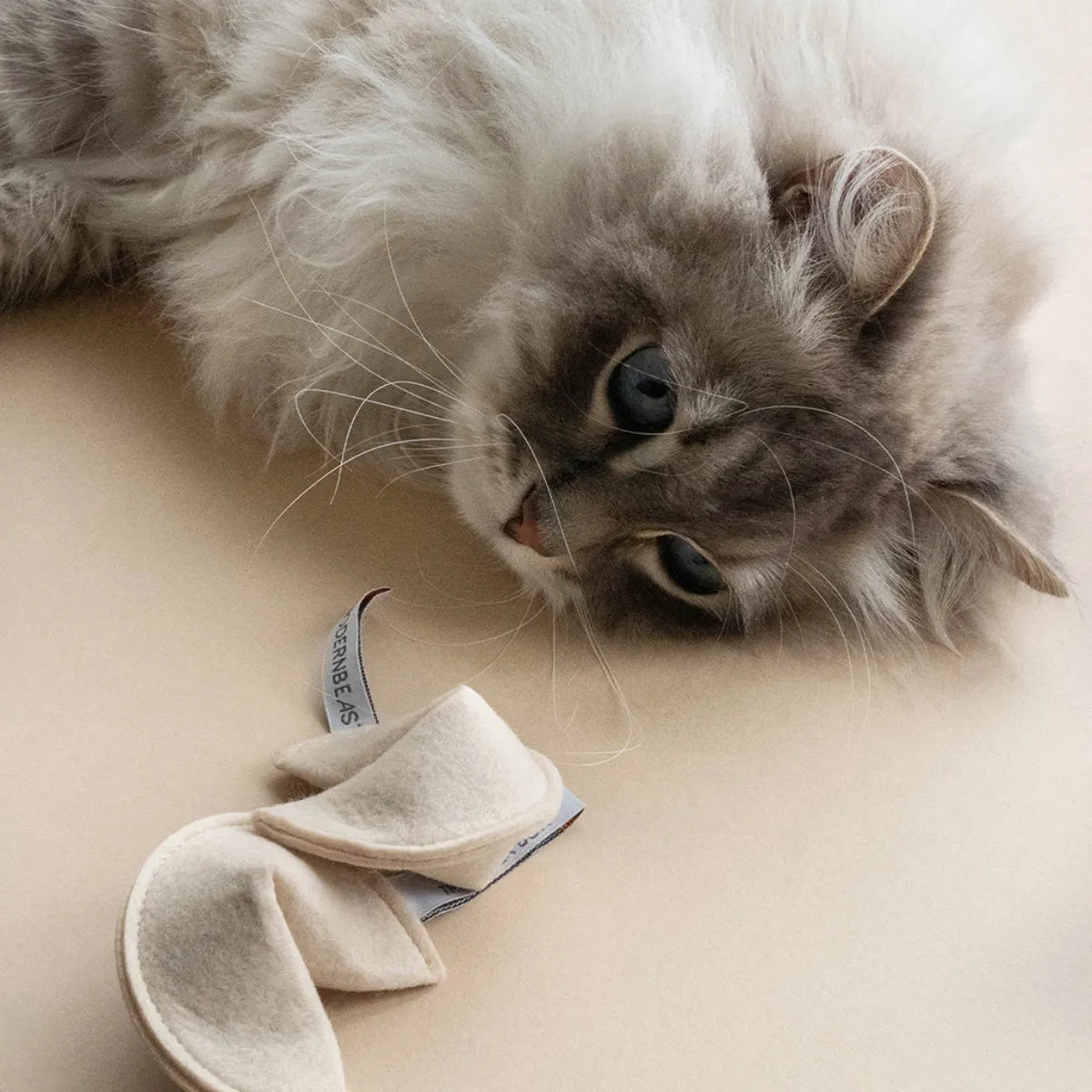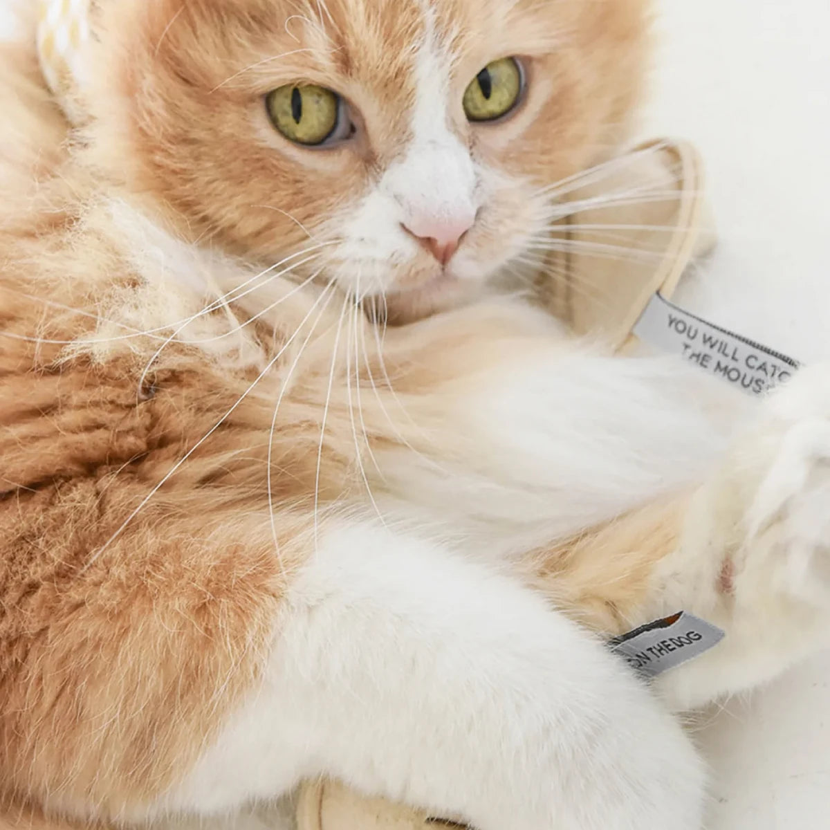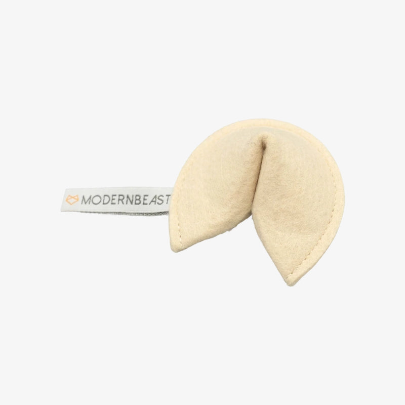 Ce jouet pour chat s'inspire du fameux fortune cookie, ce biscuit chinois qui renferme traditionnellement un message de chance. Fidèle à ce concept, le modèle de Modernbeast arbore une étiquette en polyester tissée avec l'inscription "You will catch the mouse" — "Tu attraperas la souris".