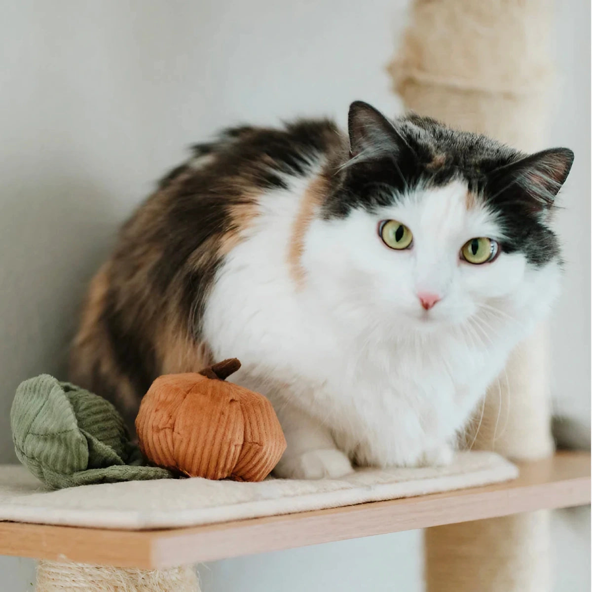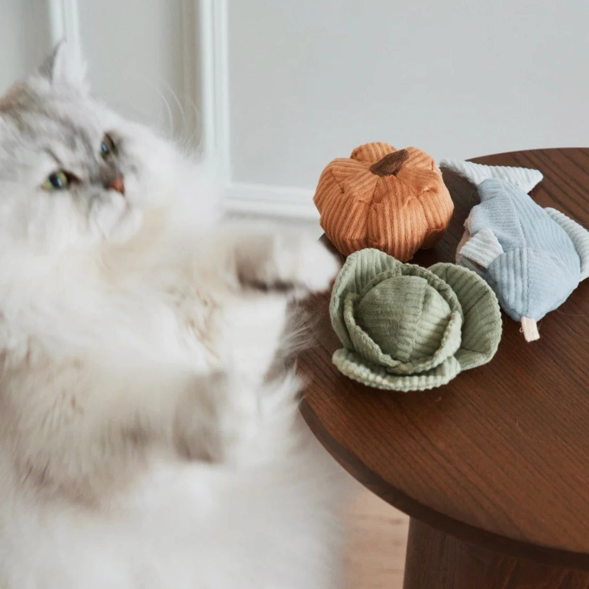 Le kitty veggie de Lambwolf Collective est un lot de deux jouets pour chat inspirés du potager. Il comprend une mini citrouille garnie d’herbe à chat avec un grelot, ainsi qu’un mini chou doté d’un grelot et de feuilles crépitantes. Les feuilles du chou permettent d’y cacher des friandises. Cela ajoute une dimension interactive et encourage le chat à fouiller.