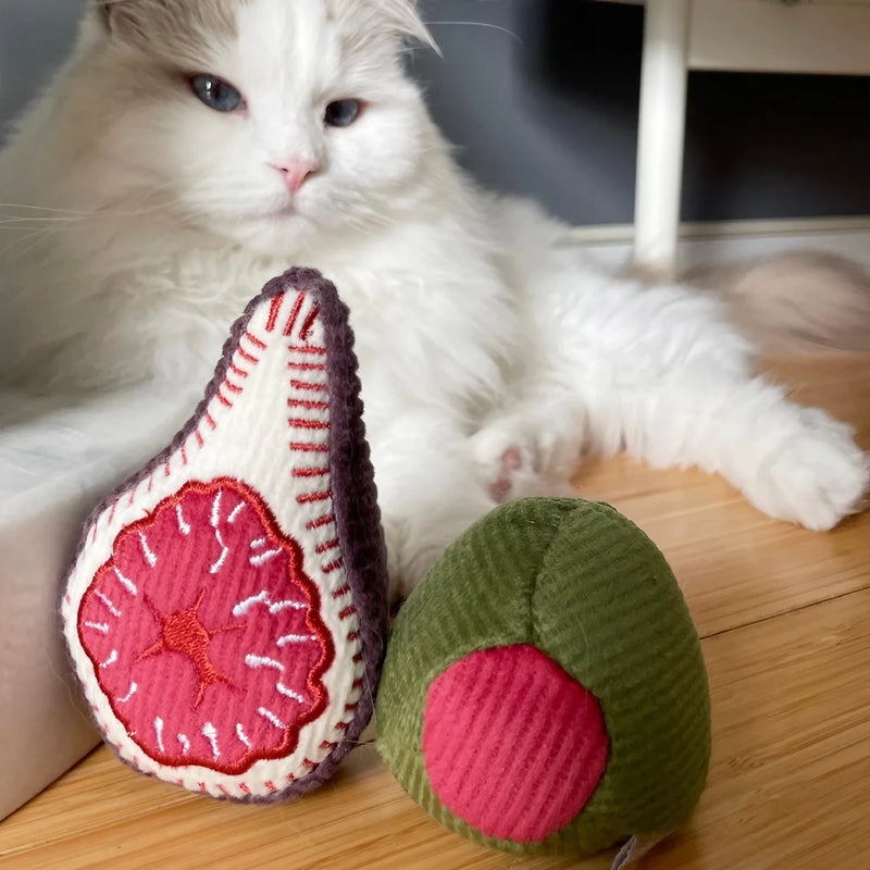 Le set Olive & Figue de Lambwolf Collective comprend deux jouets pour chat en tissu : une figue garnie d’herbe à chat et d’une clochette, et une olive avec clochette intégrée.