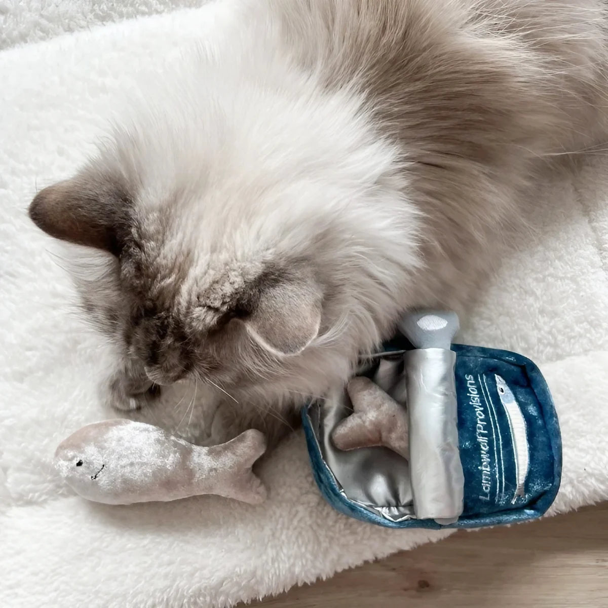 Le jeu de fouille sardines pour chat de Lambwolf Collective comprend deux sardines remplies de cataire, rangées dans leur boîte. Il permet d’occuper et de stimuler les chats.