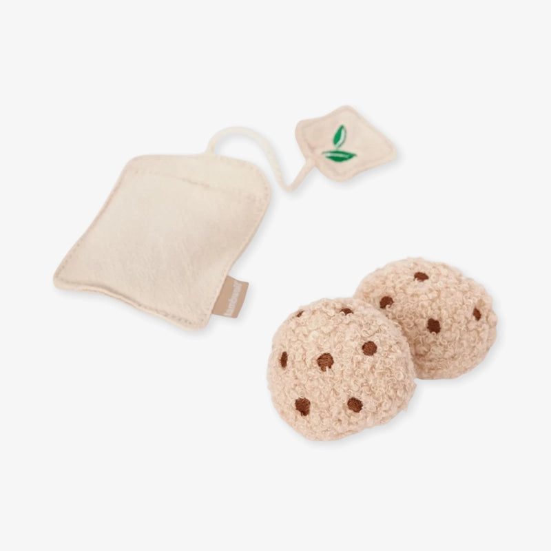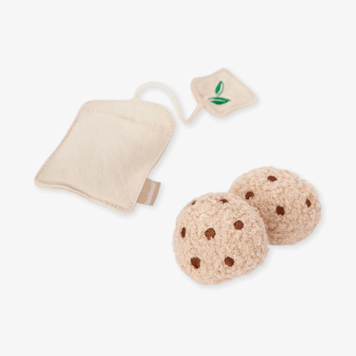 Le jouet Tea Time de Lambwolf Collective comprend deux balles en tissu bouclé crème avec des pois marron, inspirées des cookies. Chaque balle contient un grelot. Il y a aussi un sachet de thé tout doux, garni de cataire.