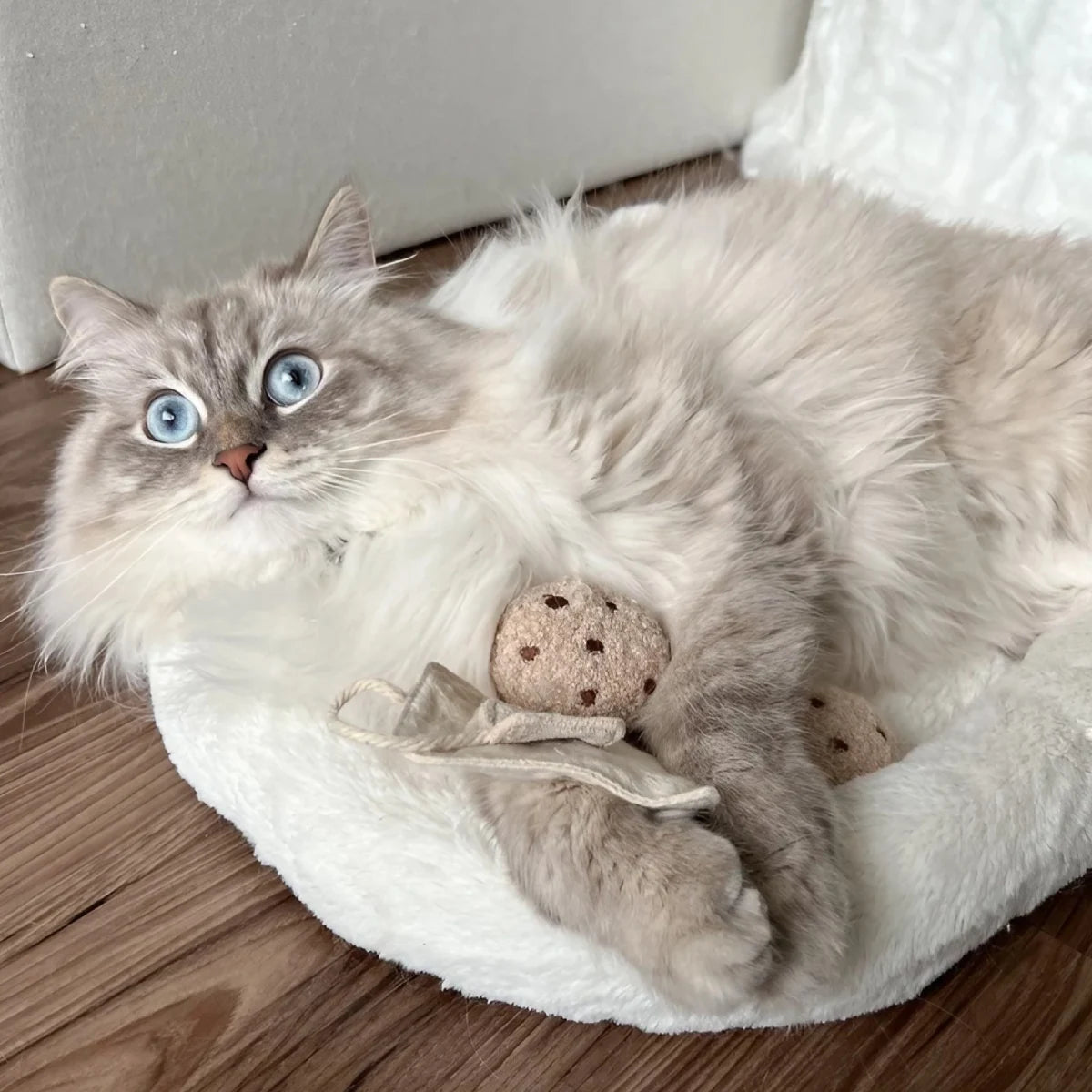 Le jouet Tea Time de Lambwolf Collective associe deux balles façon cookies avec grelot et un sachet de thé à la cataire. Un trio irrésistible pour stimuler, amuser et occuper les chats, même les plus sédentaires.