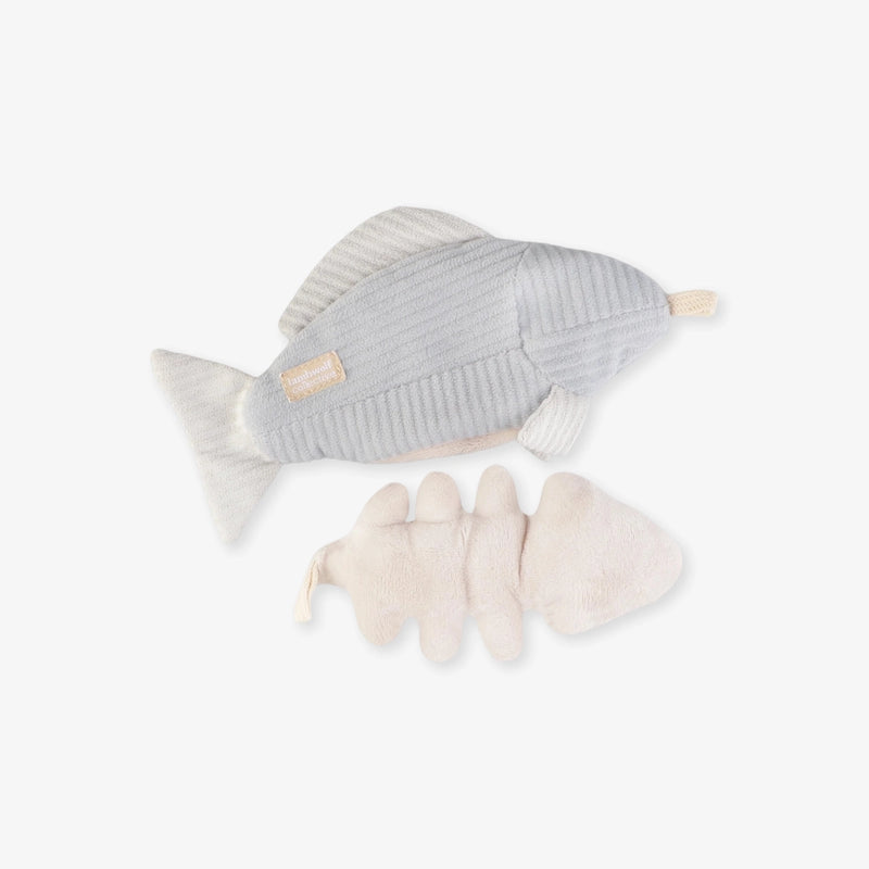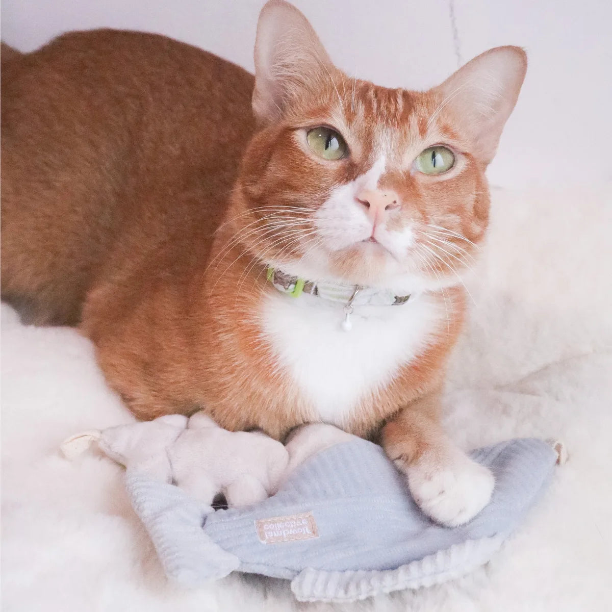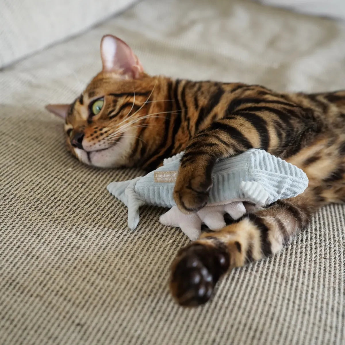 La truite, alias "Trout" de Lambwolf Collective, est un jouet d’occupation pour chat. Ce poisson en peluche cache une arête garnie d’herbe à chat avec un grelot intégré.