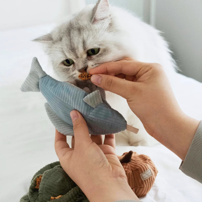 Le Trout de Lambwolf Collective est un jouet interactif pour chat. Ce poisson en peluche renferme une arête garnie d’herbe à chat et un grelot, avec un espace pour cacher des friandises.