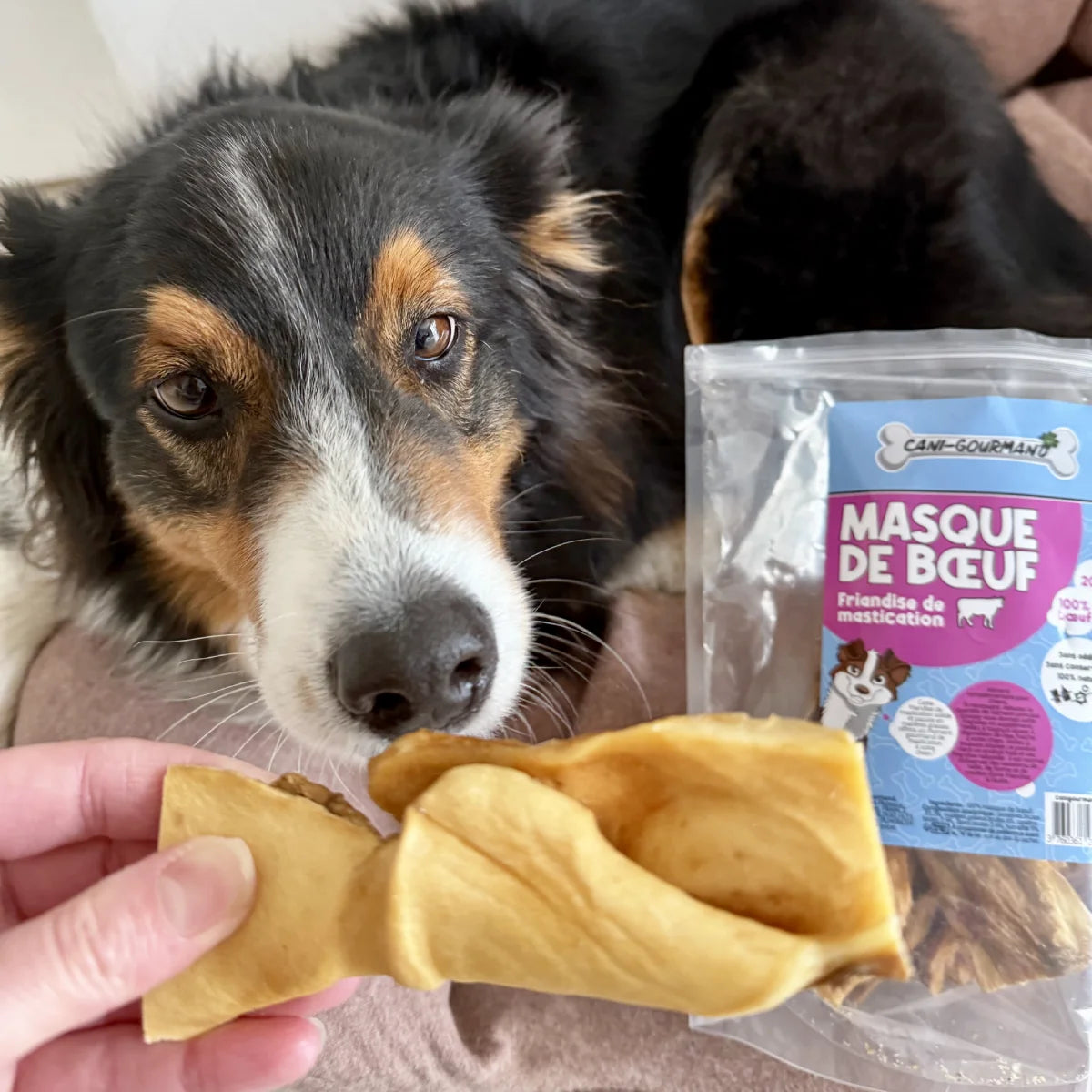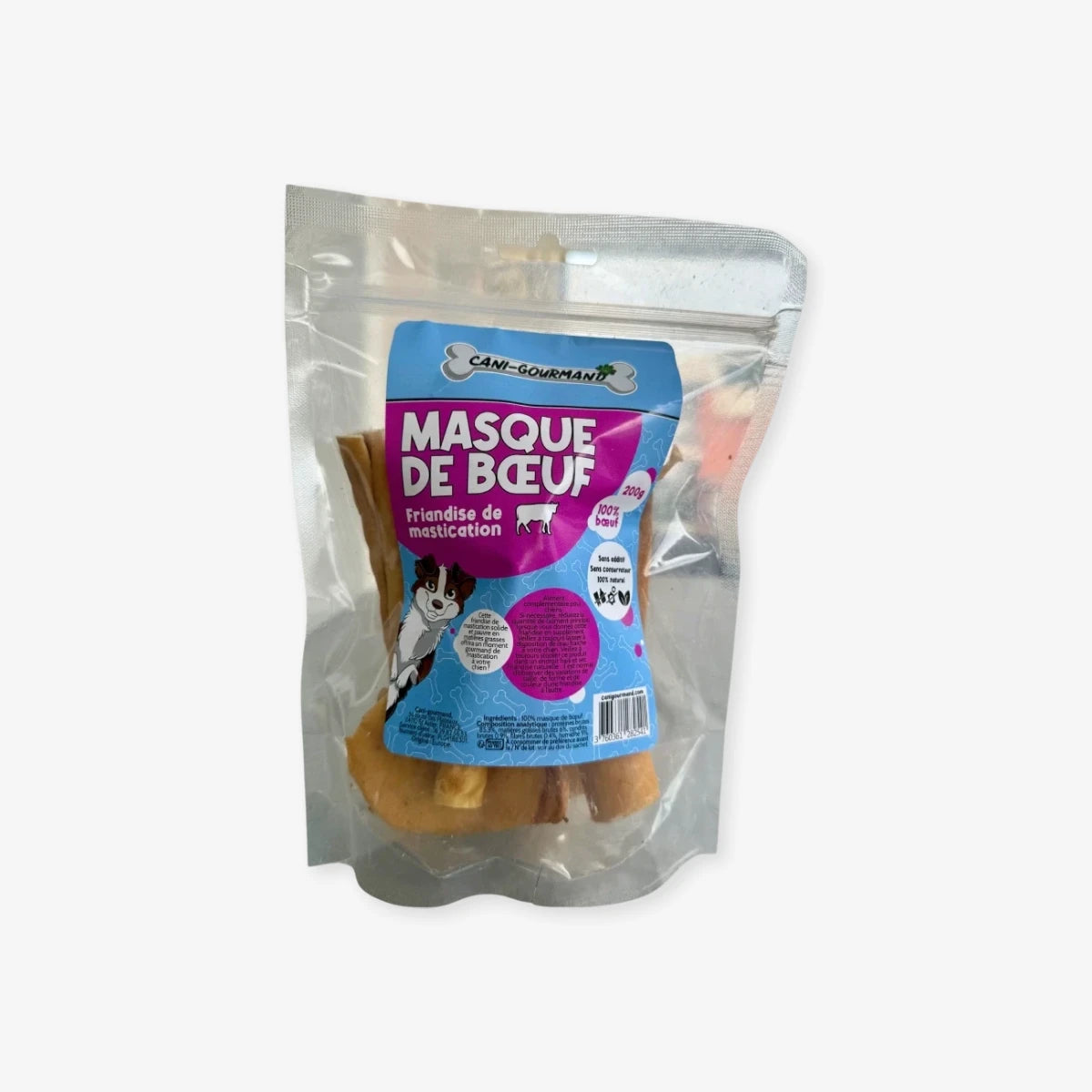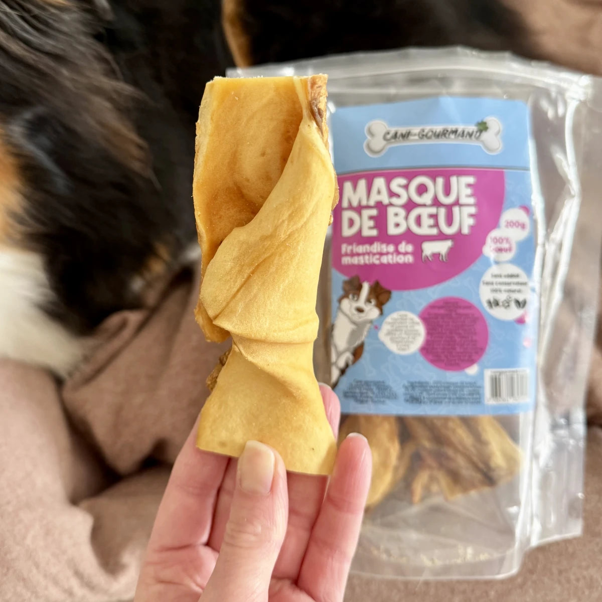 Le masque de bœuf de Canigourmand est une gourmandise à mastiquer pour chien. Il offre une longue durée d’occupation grâce à sa texture résistante, idéale pour les chiens déjà habitués à mastiquer.