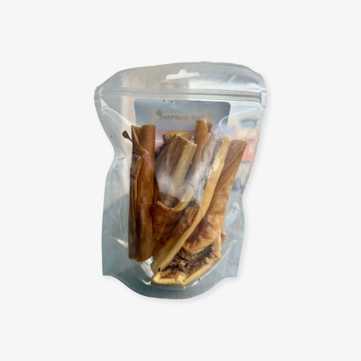 Cette mastication est riche en protéines (85,3%) et faible en matières grasses (6%). Pour plus de sécurité, il est conseillé d’utiliser le support à mâcher CHEWDEN Grip afin d’éviter tout risque d’étouffement lorsque la friandise devient trop petite.