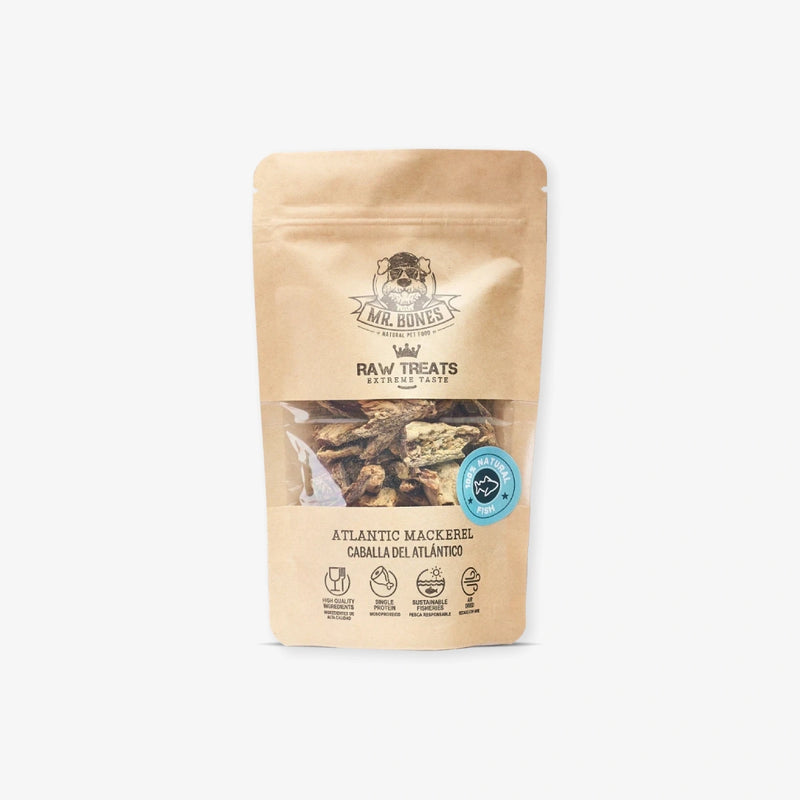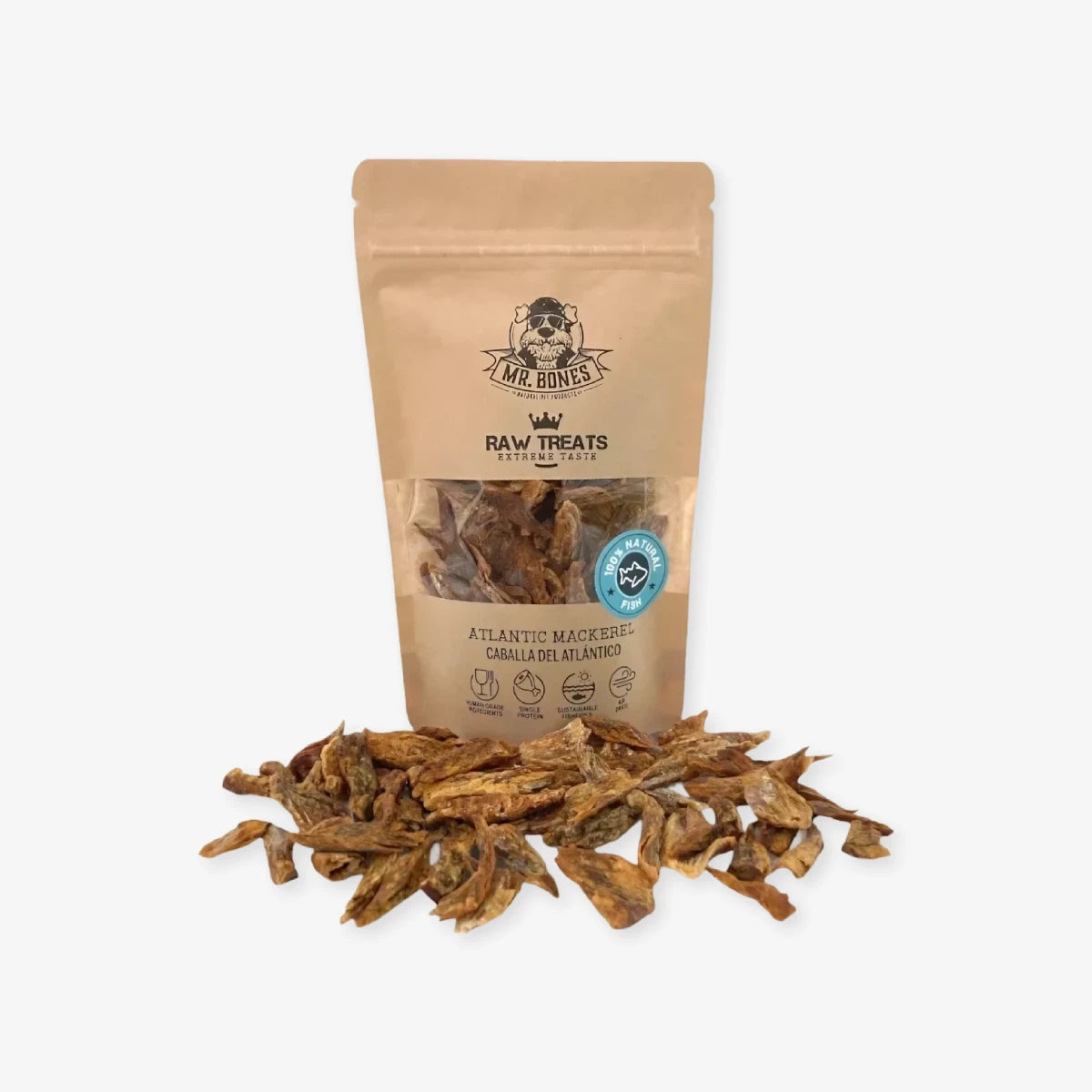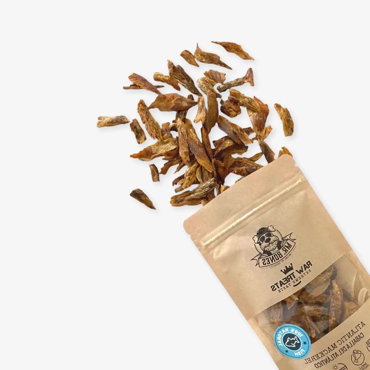 Les morceaux de maquereau sont des friandises pour chien. Elle est issue d’une pêche durable dans l’océan Atlantique, près des côtes espagnoles de Huelva. Chaque maquereau est soigneusement coupé en morceaux puis séché à basse température afin de préserver tous ses bienfaits nutritionnels. Sans céréales, sans additifs et sans conservateurs.