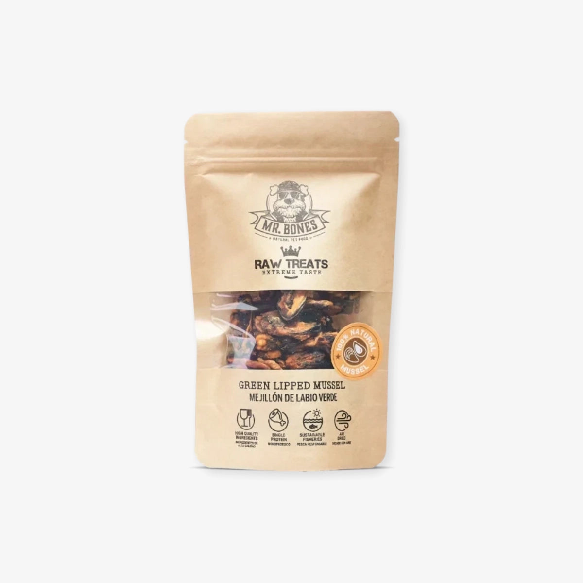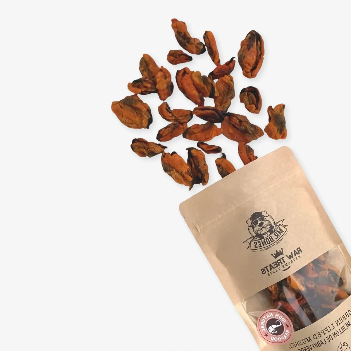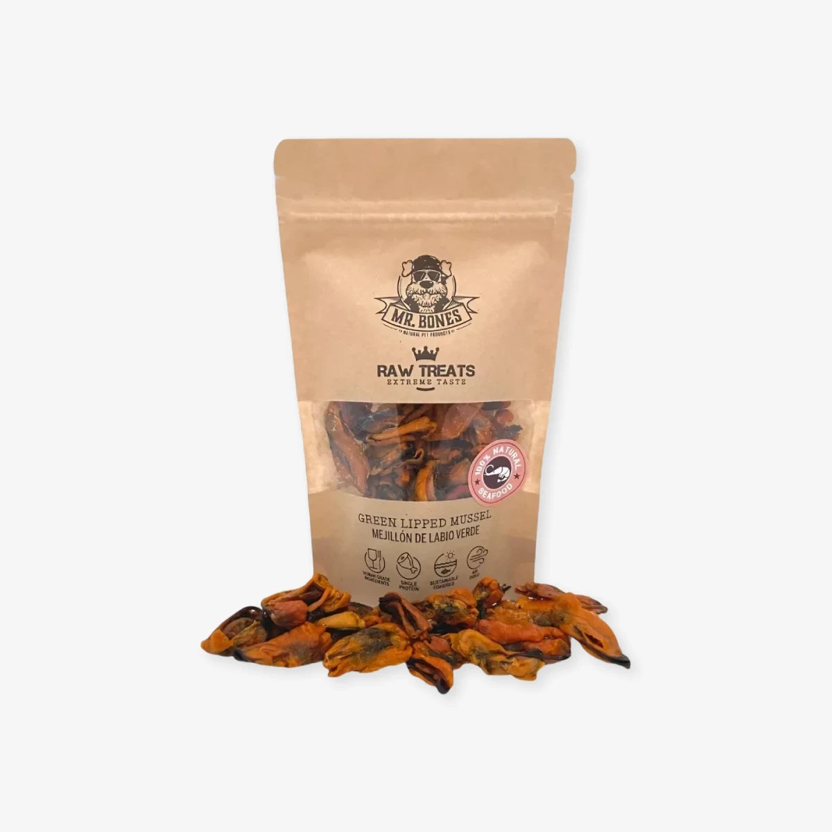 Les moules à lèvres vertes Mr Bones sont des friandises pour chien provenant d'une pêche durable en Espagne. Séchées à basse température, elles conservent tous leurs nutriments, arômes et saveurs sans l’ajout de céréales, d’additifs ou de conservateurs.