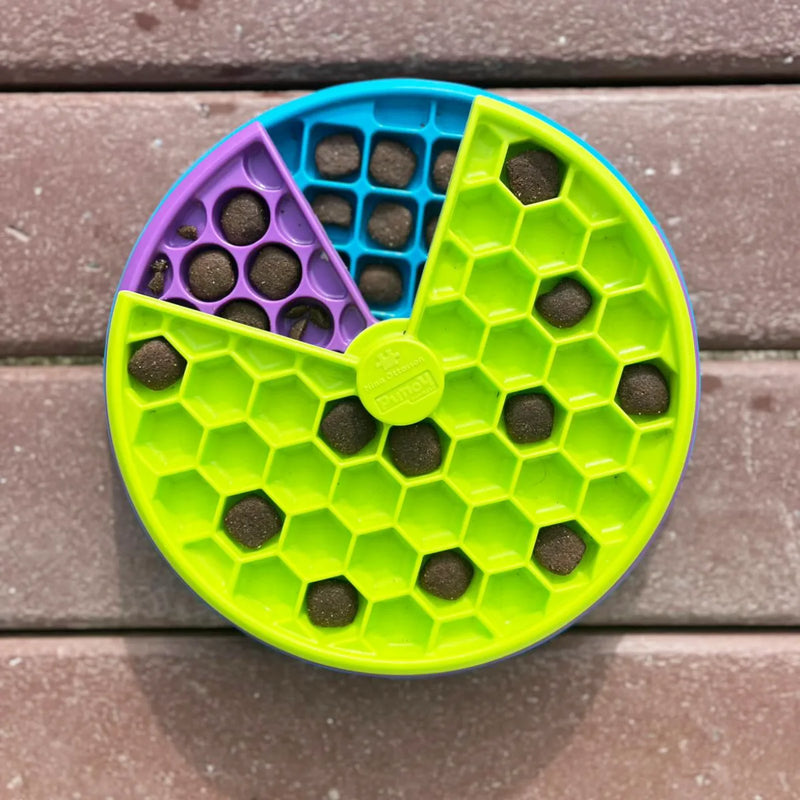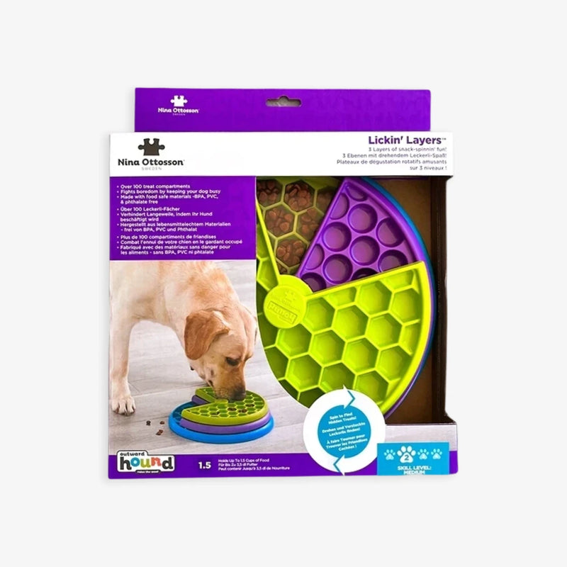 Le Lickin’ Layers est un puzzle à trois étages superposées où l'on peut cacher des friandises ou des croquettes. C'est une fusion entre un jeu de logique pour chien et une gamelle anti-glouton.