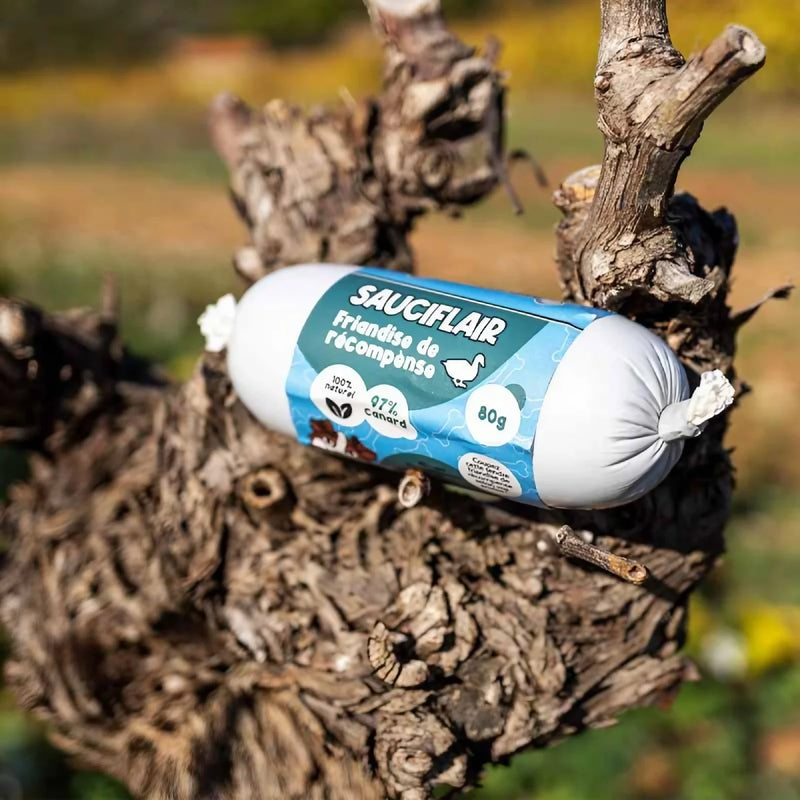 LesSauciflair au canard de Canigourmand est une friandise d'apprentissage, idéale pour l’entraînement et l’éducation canine. Ce boudin de 80g se coupe facilement en petits carrés adaptés à la taille du chien.