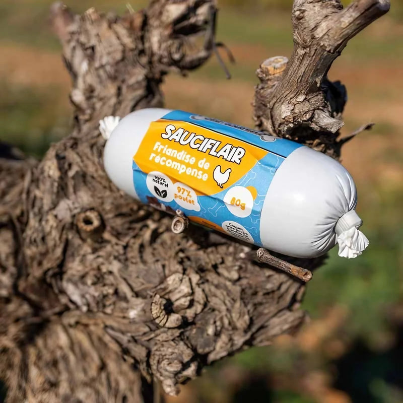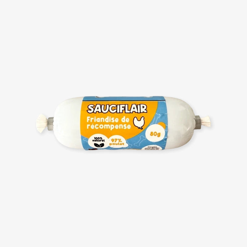 Le Sauciflair au poulet de Canigourmand est une friandise de récompense en forme de boudin de 80g. Facile à couper, il se transforme en friandises d’entraînement idéales pour l’éducation, l’apprentissage de nouveaux tours ou pour remplir les jeux d’occupation.