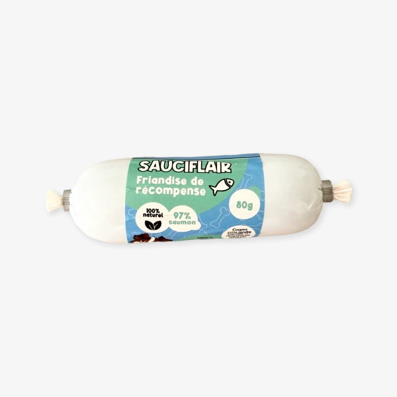 Le sauciflair au saumon de Canigourmand est une friandise de récompense en forme de boudin de 80g. Facile à couper, il se transforme en friandises d’entraînement idéales pour l’éducation, l’apprentissage de nouveaux tours ou pour remplir les jeux d’occupation.