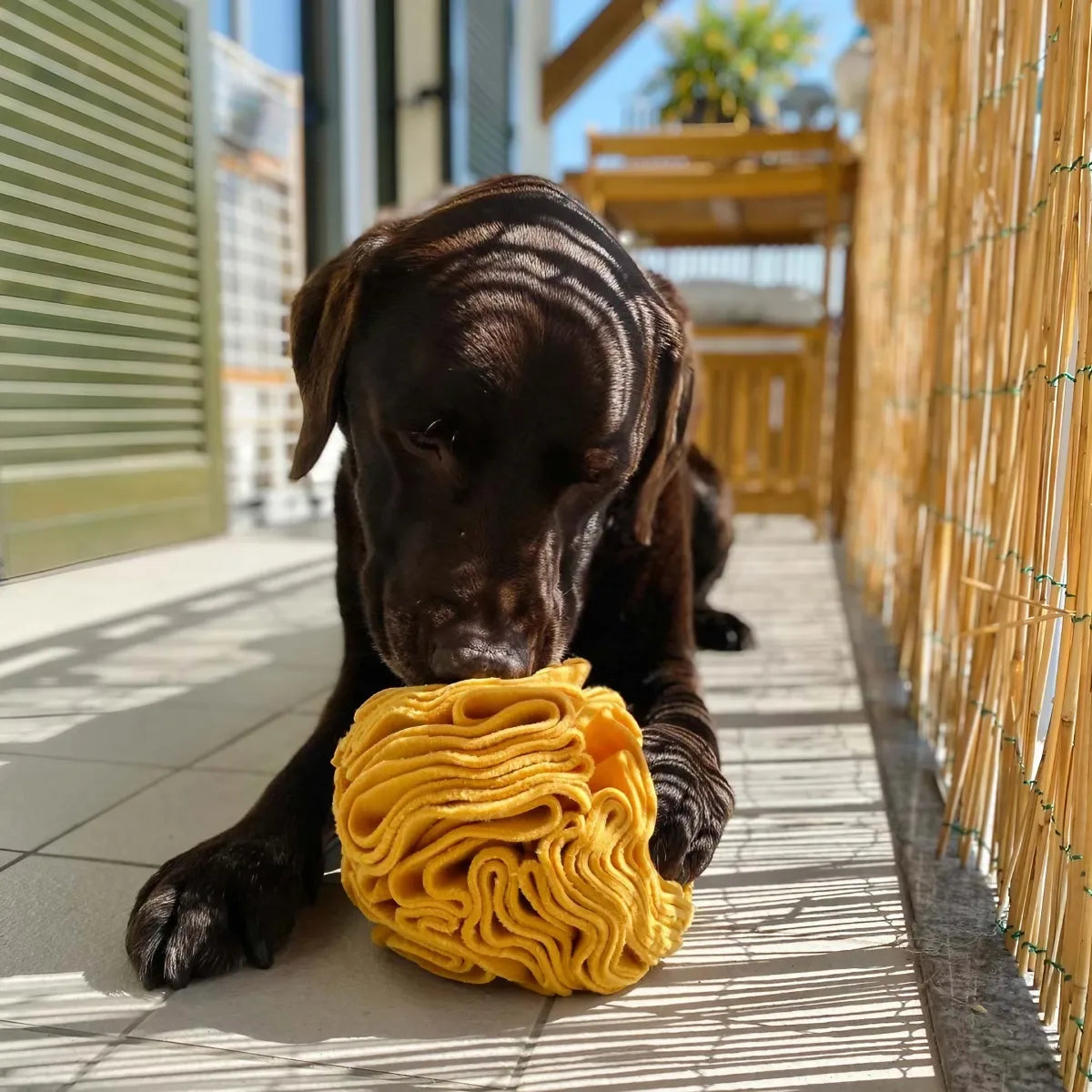 Le jeu consiste à cacher des friandises sèches ou croquettes entre les plis du tissu. Plus les friandises sont insérées profondément, plus le jeu devient difficile pour le chien. La balle de fouille est plus compliquée qu’un tapis de fouille, car elle roule avec les coups de truffe ou de patte.