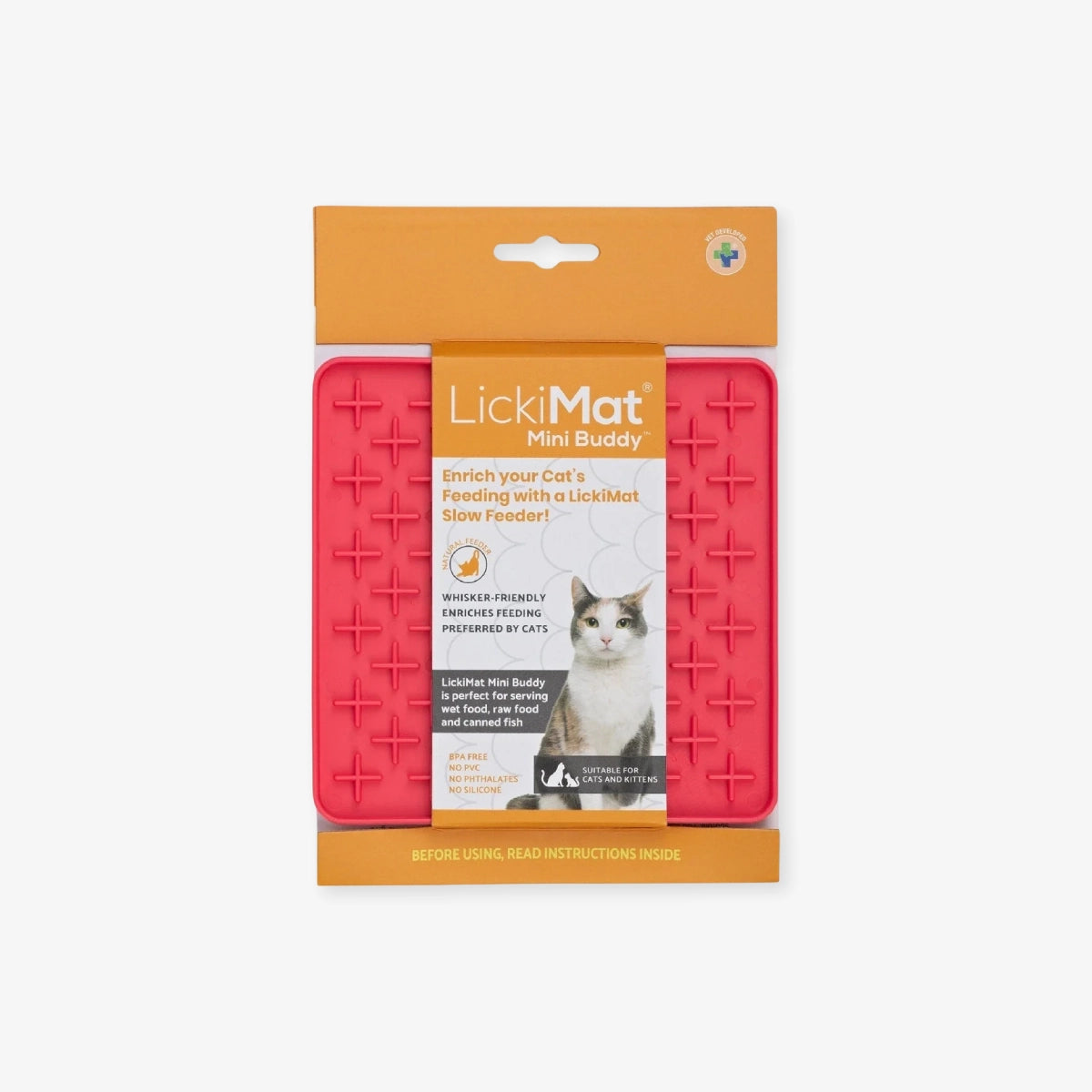 Le tapis de léchage Mini Buddy pour chat de Lickimat aide le chat à manger plus lentement et à se détendre. Cela permet aussi de l’occuper et de se régaler.