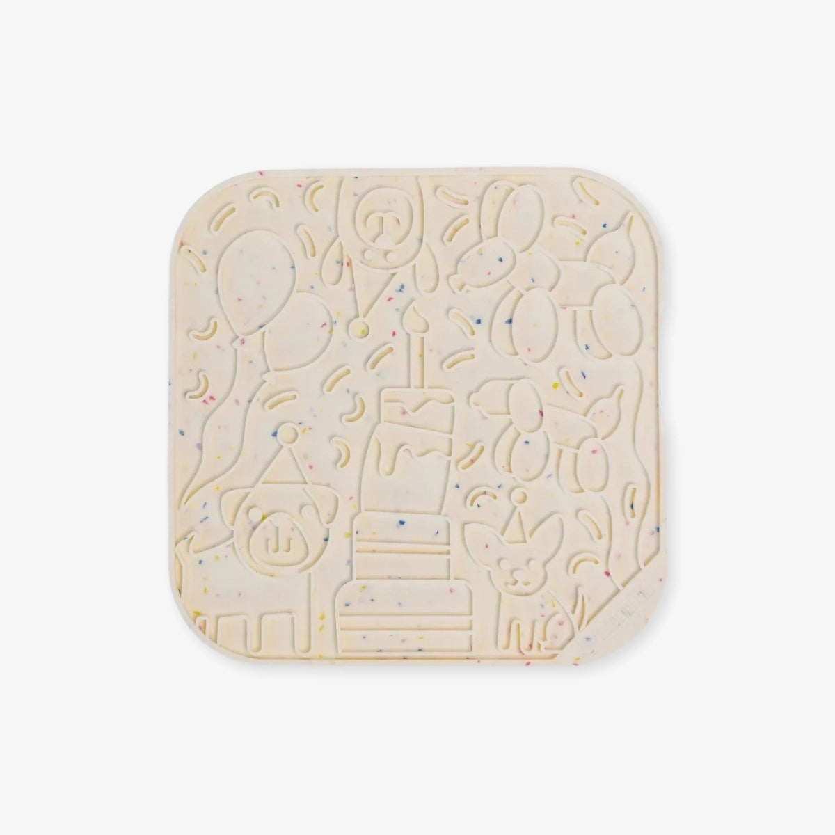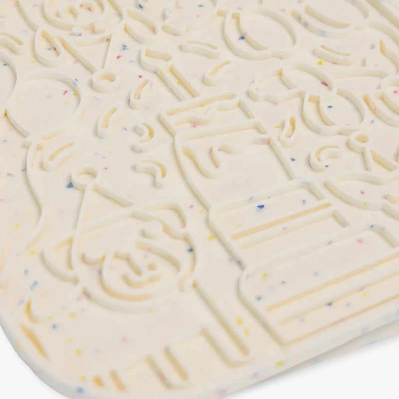 Le tapis de léchage pour chien Anniversaire de The Modern Dog Company apporte une touche de fête à chaque repas. Son design en relief reprend les symboles d’un anniversaire : gâteau, bougie, ballons, chapeaux de fête et confettis intégrés.