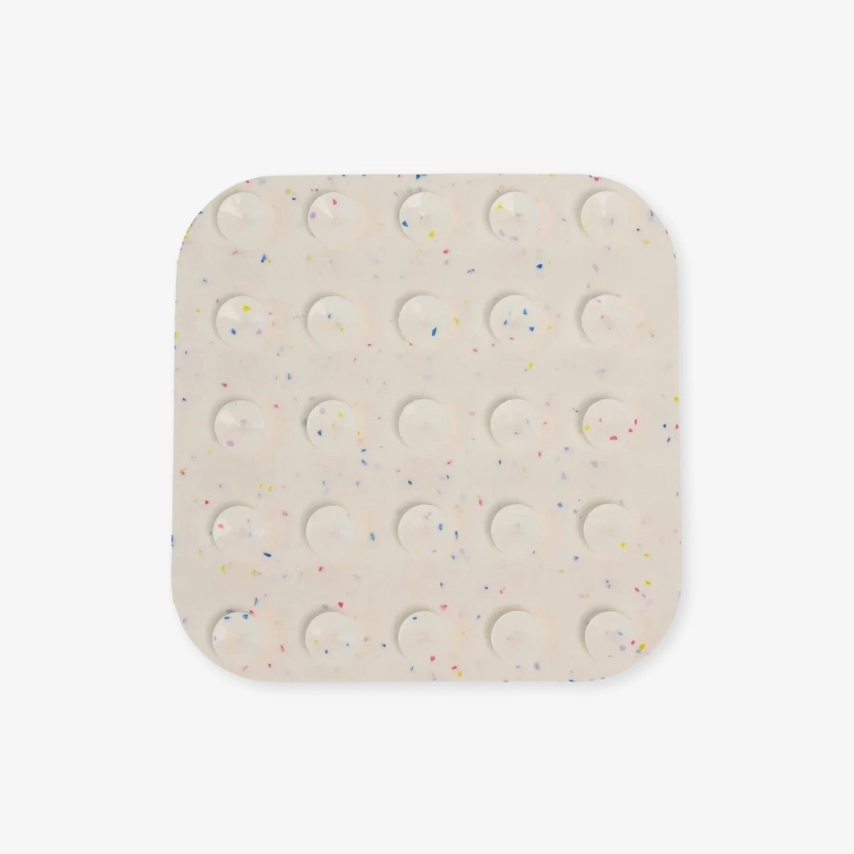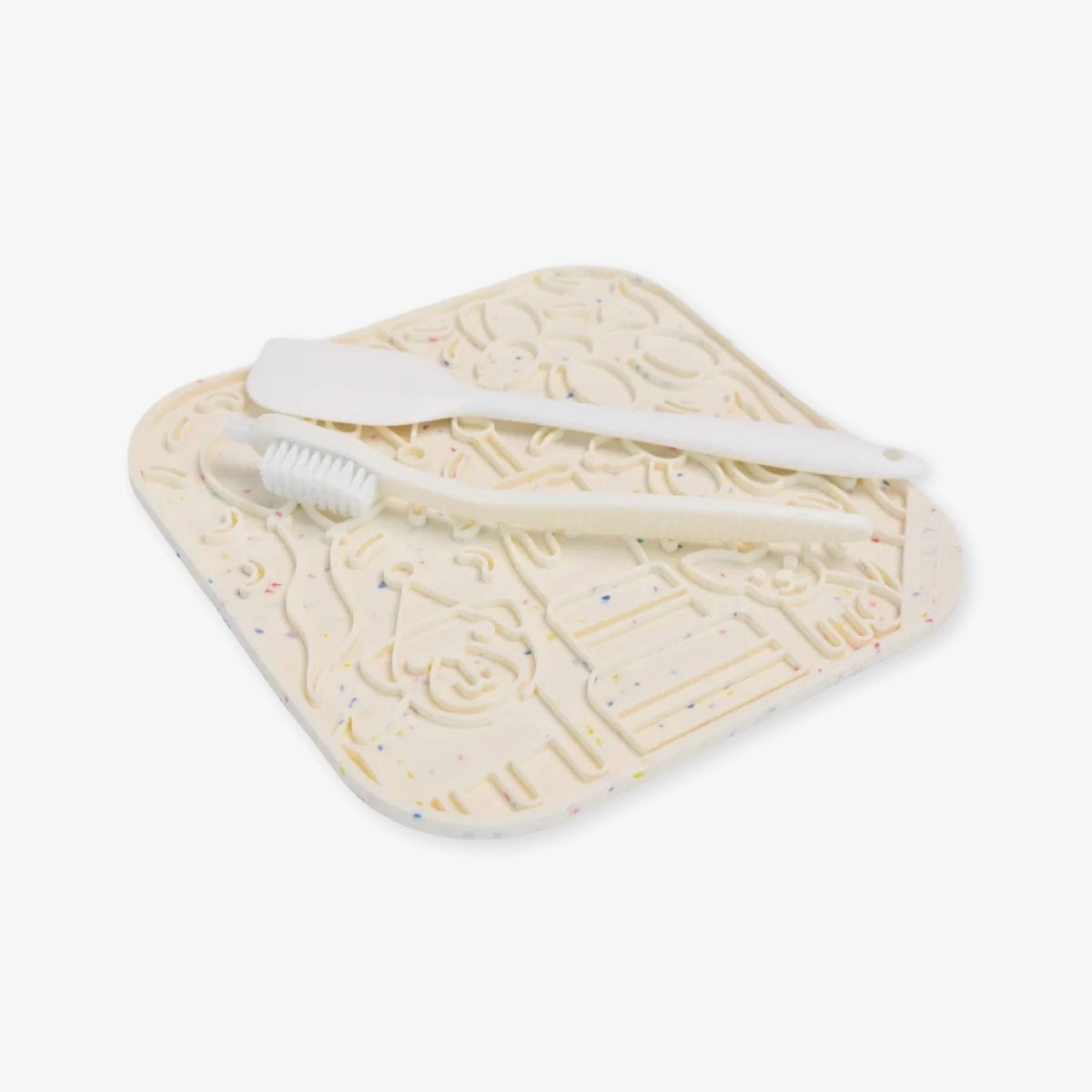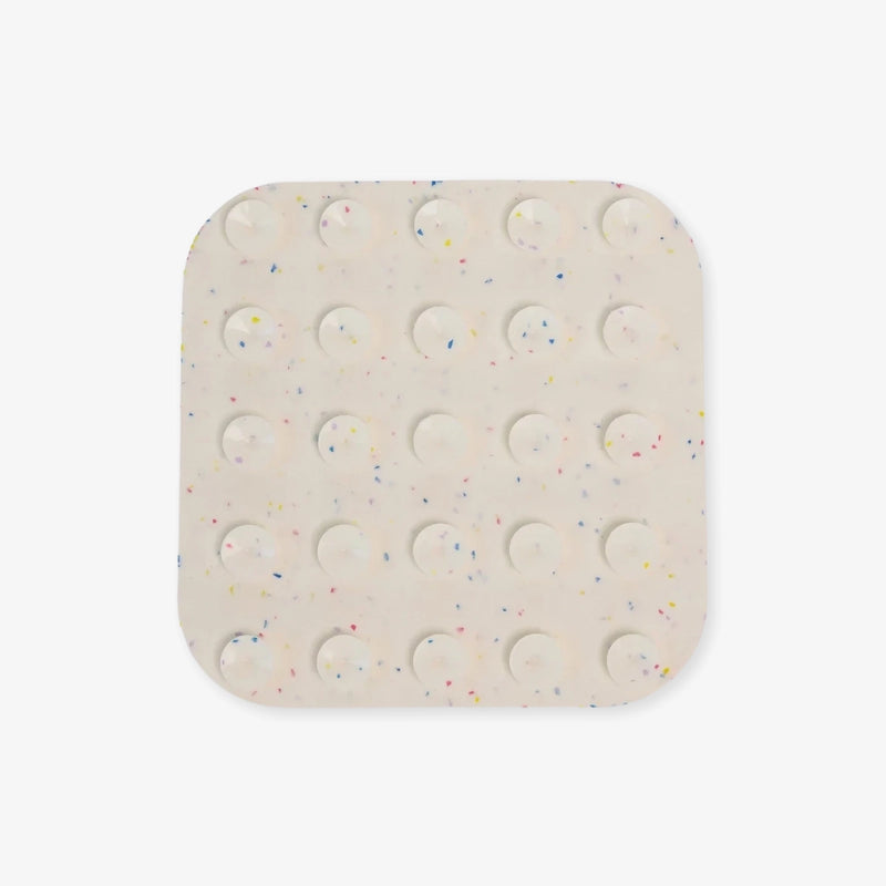 Des ventouses situées au dos permettent de le fixer facilement sur une surface lisse, au sol ou sur une paroi verticale. Le tapis est en silicone alimentaire, fourni avec une spatule pour l'étalage et une brosse pour le nettoyage.