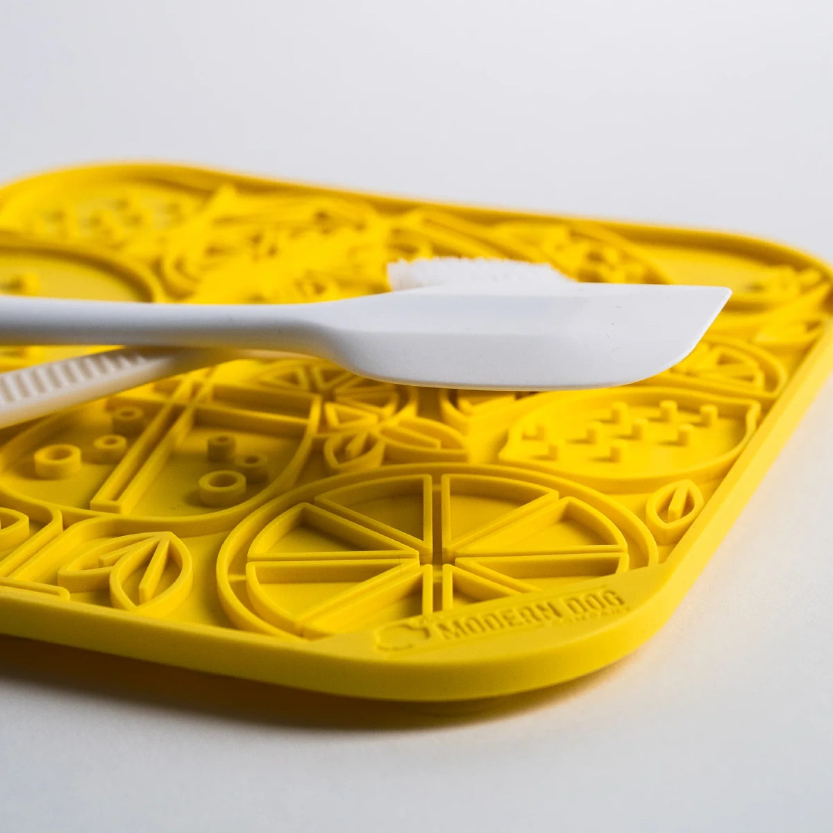 Le tapis de léchage Limoncello pour chien de The Modern Dog Company invite à un moment rafraîchissant et ensoleillé. Son jaune citron et ses motifs en relief — citron, limonade, part de pizza, feuilles — évoquent l’été et la dolce vita.