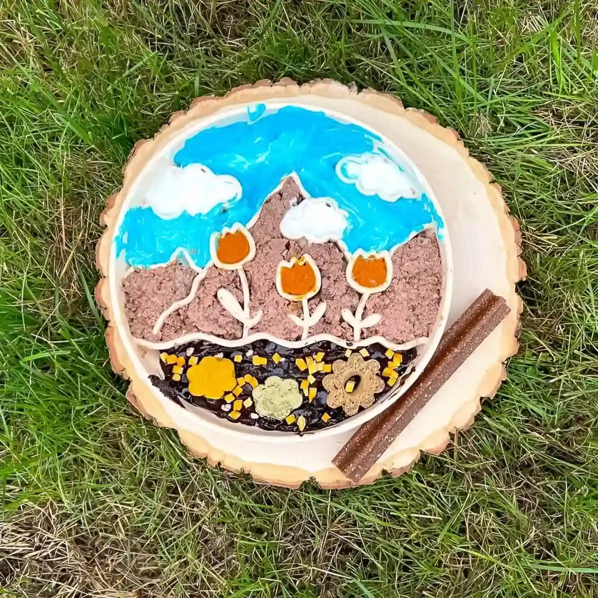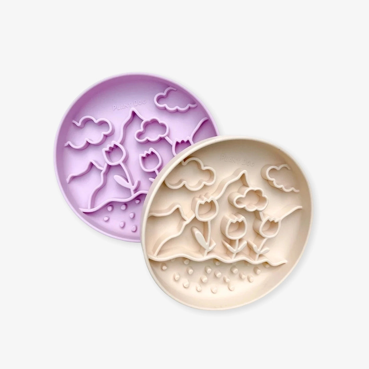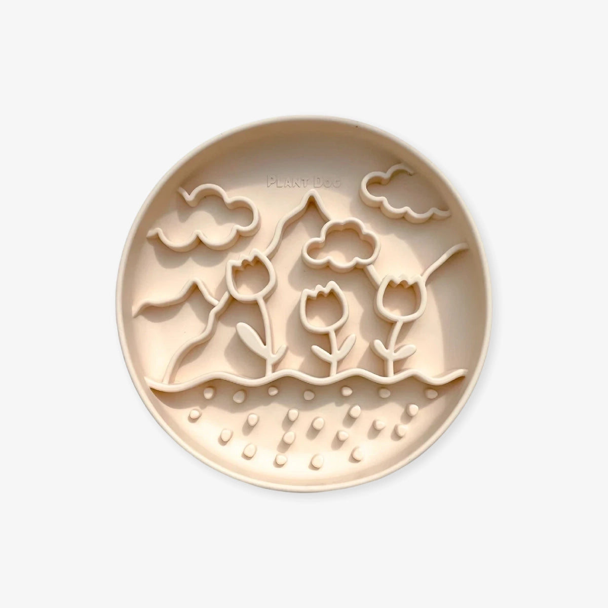 Son design est inspiré des paysages printaniers, avec des tulipes, des montagnes et des nuages. La ventouse au dos maintient le tapis en place, ce qui empêche tout déplacement pendant que le chien mange.
