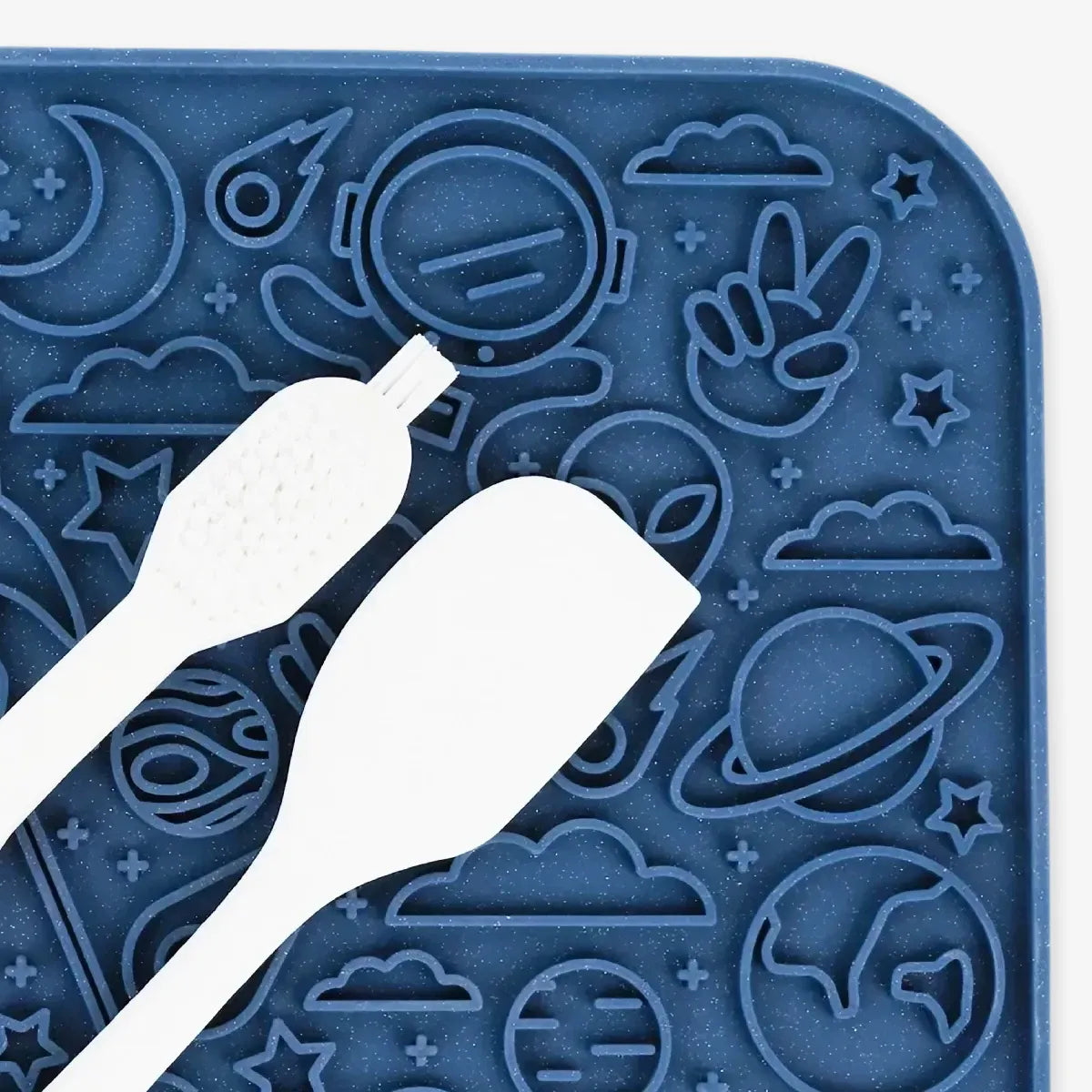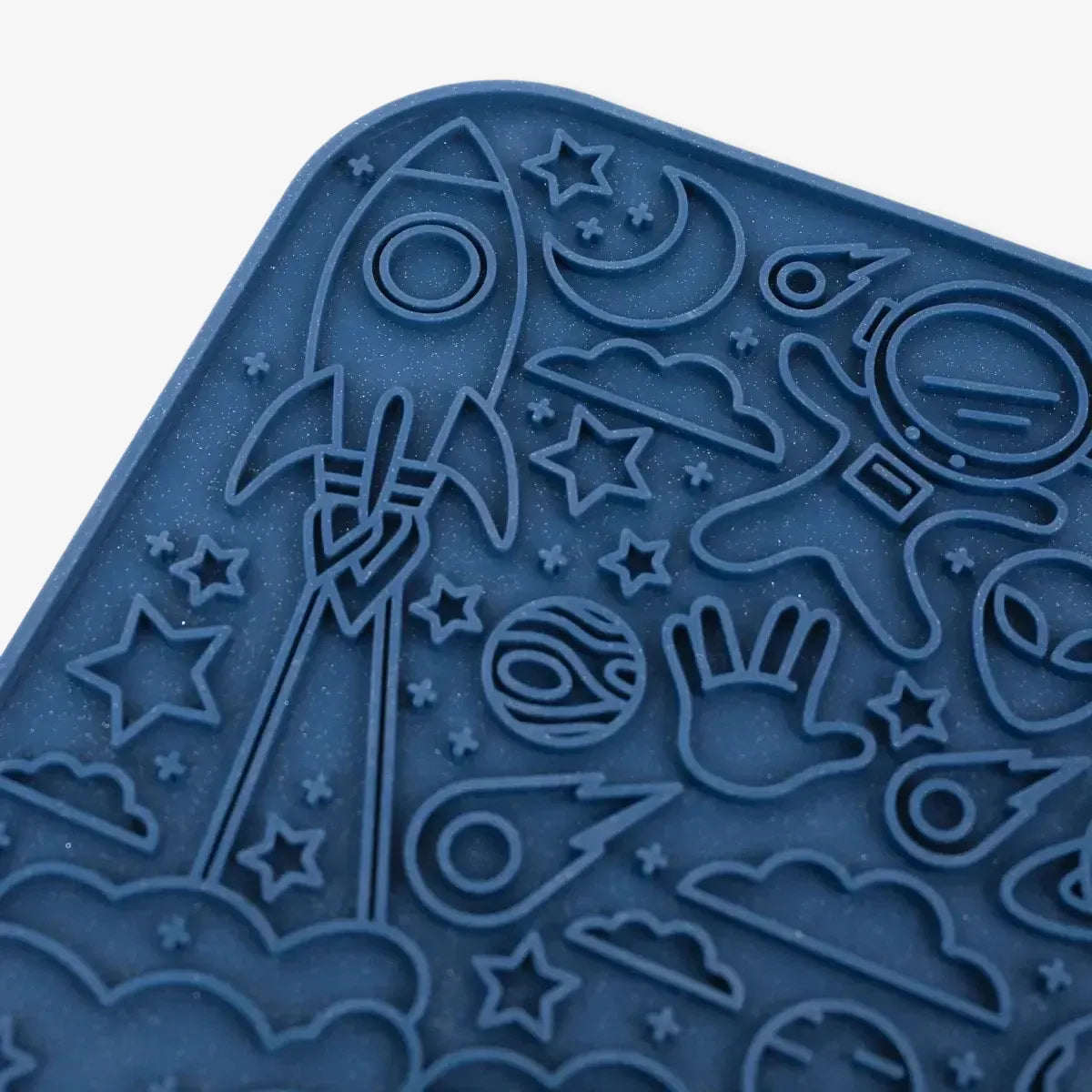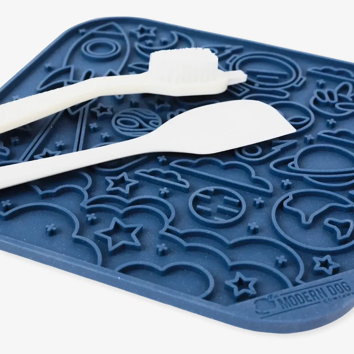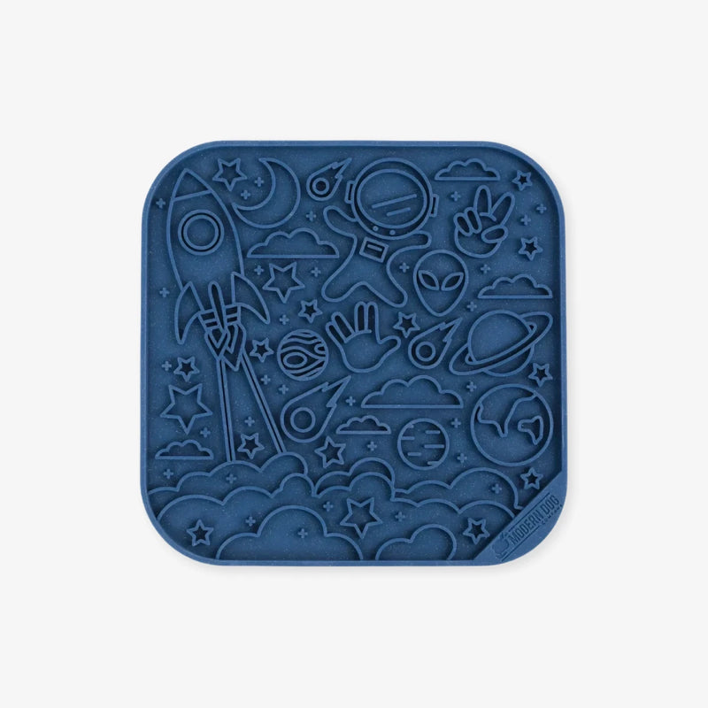 Le tapis de léche pour chien Spatial de The Modern Dog Company se distingue par sa couleur bleu pailleté et ses motifs en relief inspirés de l’espace : fusée, astronaute, alien, planètes et étoiles. Un design original qui invite à l’exploration tout en stimulant le chien pendant le repas.