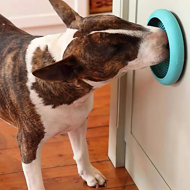 • Contre un mur ou une paroi, avec des aliments humides ou congelés : Vous pouvez préparer le tapis en le garnissant de nourriture, puis le laisser au congélateur pendant quelques heures. Cela devient une bonne activité de rafraîchissement pour le chien durant l'été.