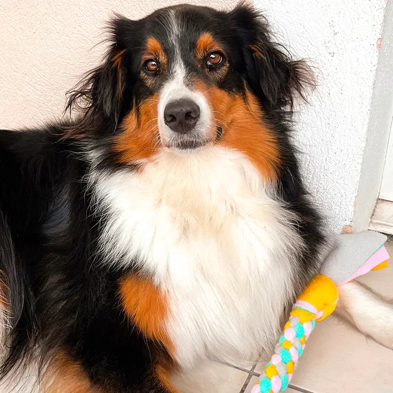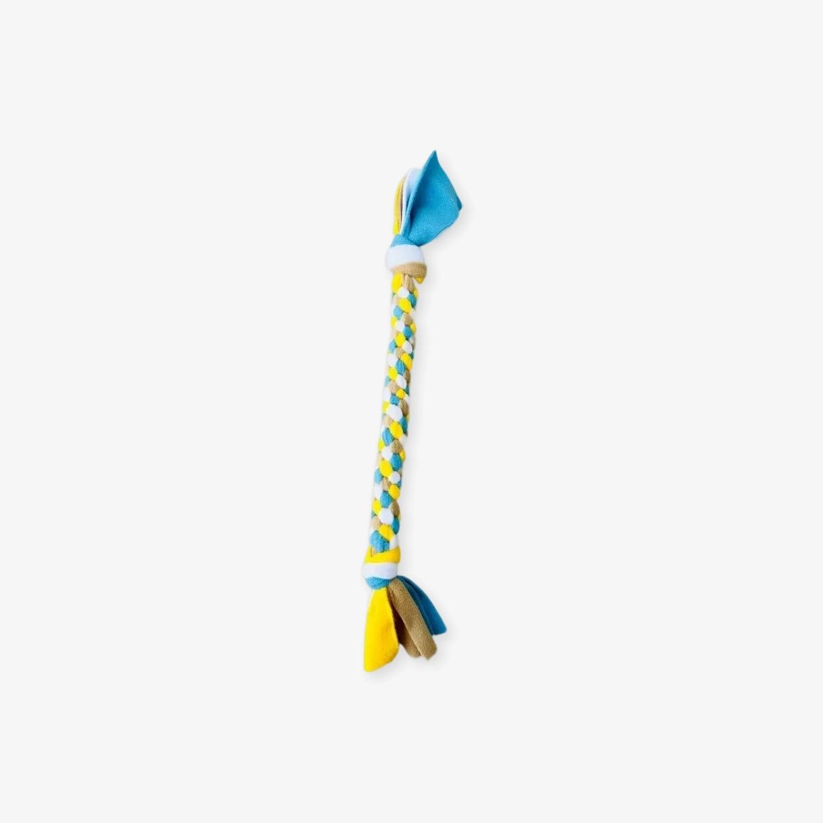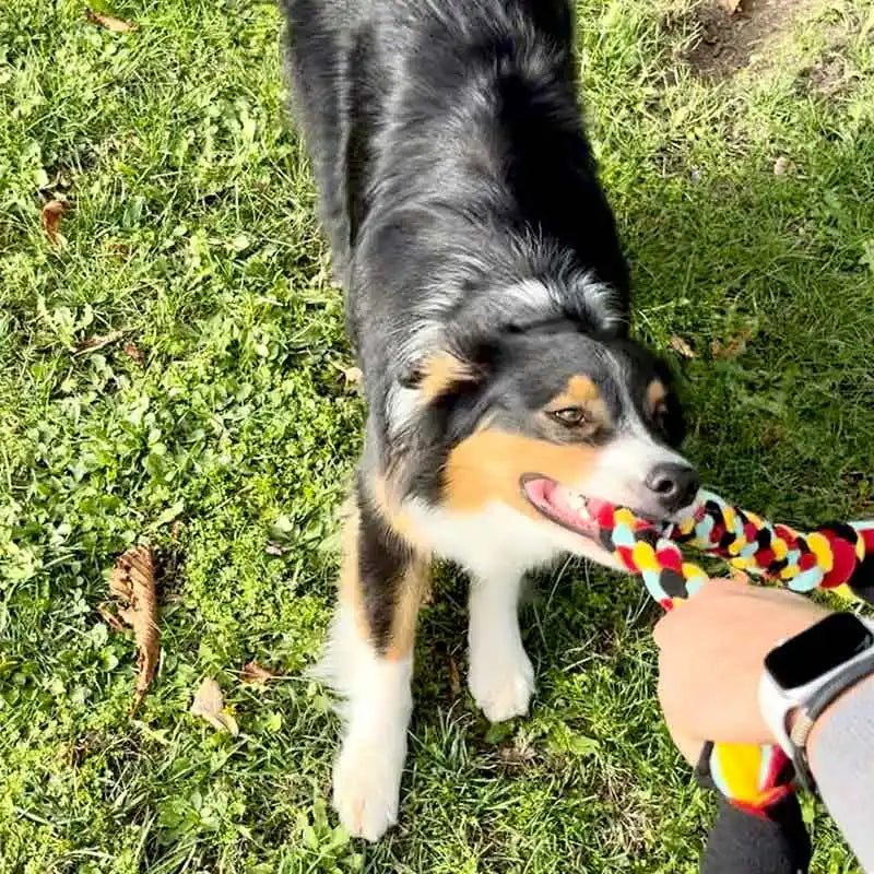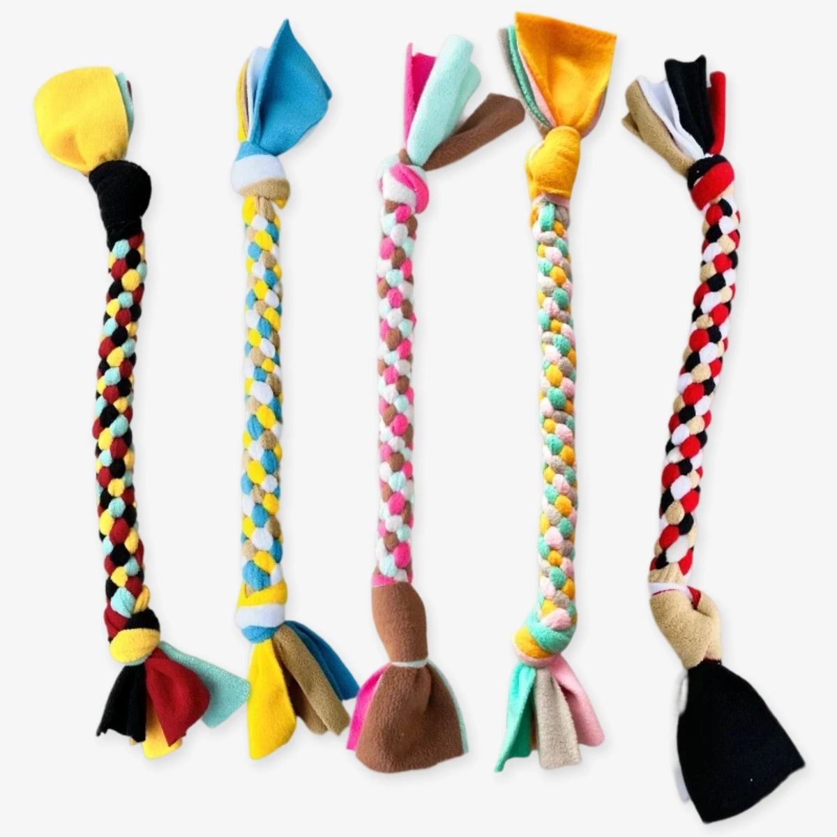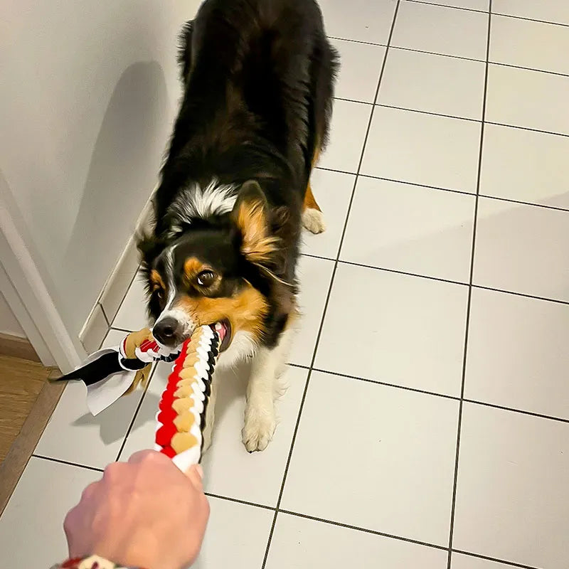 Le tug scoubidou pour chien artisanal en polaire est un jeu de tire-tire. Ce jouet permet d’allier moment de complicité, dépense physique et apprentissage de l’auto-contrôle. Jouer, apprendre, complicité = le trio gagnant du tug !